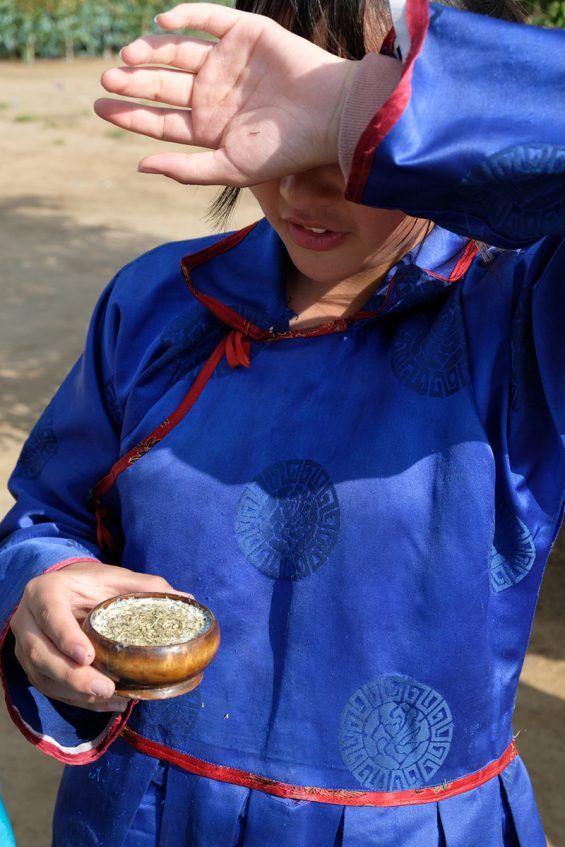 По-настоящему принять себя и духовную культуру моего народа мне помогла фотография. Впервые приехав в Бурятию с камерой в 2016 году, я снимала религиозные события: большие празднества и спортивные состязания, маленькие родовые молебны, буддийские обряды очищения и ритуальный танец цам. Поначалу фотоаппарат служил неким щитом между мной и происходящим вокруг. С помощью камеры я отделяла себя от окружающих и от веры, была сторонним наблюдателем. При этом я наблюдала вещи, которые были знакомы с детства и вызывали необъяснимый внутренний трепет: как брызгают молоком и водкой вокруг, угощая духов, как выкидывают из окна монетки, проезжая мимо культового места. Постепенно стеснение уходило — и приходило принятие, я начала чувствовать себя частью своей семьи и культуры.