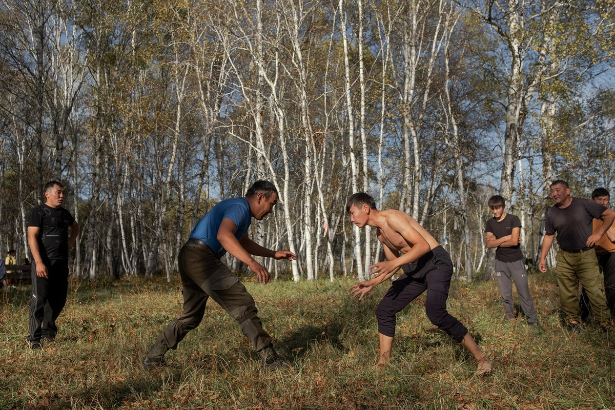Национальная борьба бүхэ барилдаан во время большого тайлгана в селе НуртаФото: Аюна Шагдурова