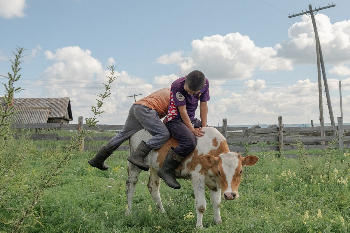 Мальчики играют, седлая теленка, в деревне Корсук Иркутской областиФото: Аюна Шагдурова Я родилась и выросла в Санкт-Петербурге. Но моя родина, мое место силы, или тоонто нютаг по-бурятски, — деревня Дутулур, в которой рос мой папа. Это деревня в горах, в Закаменском районе Бурятии, граничащем с Монголией. Там я проводила летние каникулы, и именно оттуда мои самые счастливые детские воспоминания. Во многом это универсальный опыт лета в деревне и знакомые детям чувственные переживания: теплая рыхлость только что испеченного хлеба, резкий запах клопов в ведерке с земляникой, бесконечные чашки сепаратора, отделяющего сливки от молока, которые моешь полупрозрачной от старости марлевой тряпкой. В Дутулуре я жила у тообии и таабай — бабушки и дедушки — вместе с двоюродными братьями и сестрами, тетей и дядями, также приезжавшими на лето в деревню. Старики держали огород и скот, нам было чем заняться. А у взрослых было свое главное занятие — каждое лето вся семья съезжалась на сенокос.