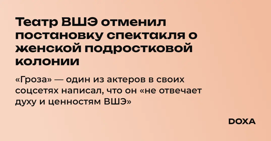 В театре Высшей школы экономики отменили показ спектакля «Зона», обратило внимание издание «Гроза». Спектакль не разрешили показывать, потому что он «не отвечает духу и ценностям ВШЭ», стало известно из соцсетей одного из актеров.
