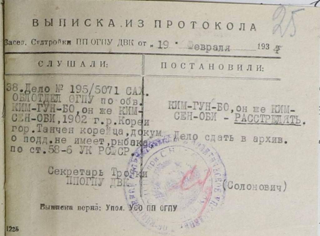 "Во время посадки во дворе НКВД в кузове машины на правой скамейке сидел только один арестованный – старик с бородой. Он из японской концессии. Я с ним сидел в одной камере в совхозе, фамилии его не знаю. После меня привели пожилого бритого мужчину небольшого роста, он сел рядом. После него пришел арестованный Ольшевский, работавший вместе со мной на японской концессии промысла Эхаби. Больше никого не привели, и нас отправили вчетвером.