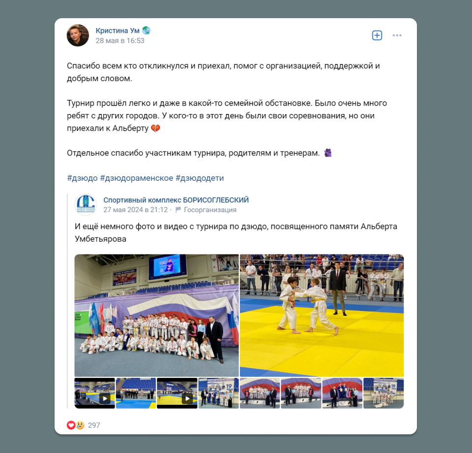 26 мая в Раменском прошел турнир по дзюдо, посвященный памяти Альберта. Нас поддержал тренер и неравнодушные люди — и финансово, и морально, кто-то предложил свою помощь по наградам, по баннерам. Хотелось сделать что-то для детей и в то же время в памяти об Альберте. Турнир прошел отлично. Очень благодарна ребятам, что приехали.