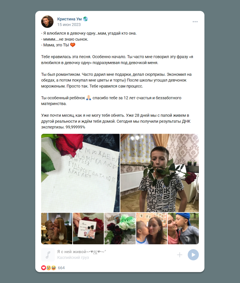 Из поста Кристины Умбетьяровой Сына мы хоронили на 41 день со дня смерти, в закрытом гробу. Мне не дали на него посмотреть. Я с ним не простилась, наверное, поэтому мозг не воспринимает тот факт, что его больше нет. И каждый вечер я жду его. Жду, что он сейчас выбежит из комнаты и скажет: «Привет, мам. Как прошел твой день?». И вроде ты понимаешь, что он больше не придет, ты ходишь к нему на могилу, но все равно ждешь…