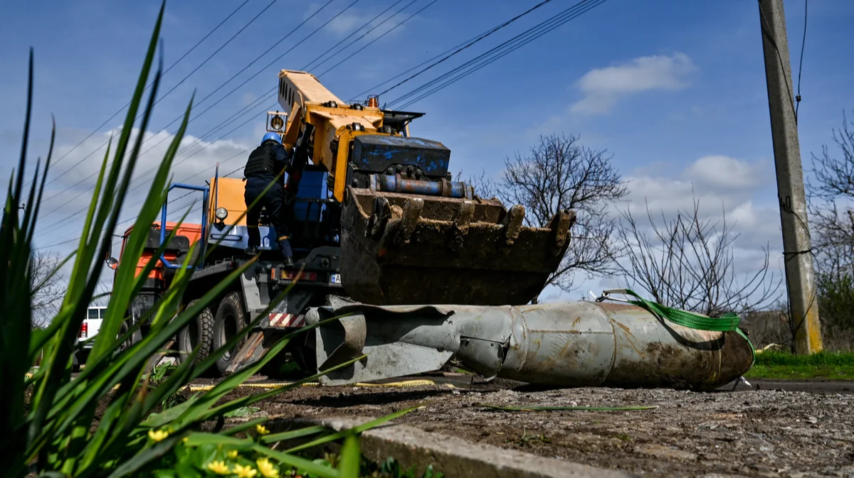 Украинские спасатели готовят к погрузке найденную авиационную бомбу ФАБ-500 в Орехове Запорожской области, Украина, 4 апреля 2023 года. Фото: Дмитрий Смолиенко / Укр