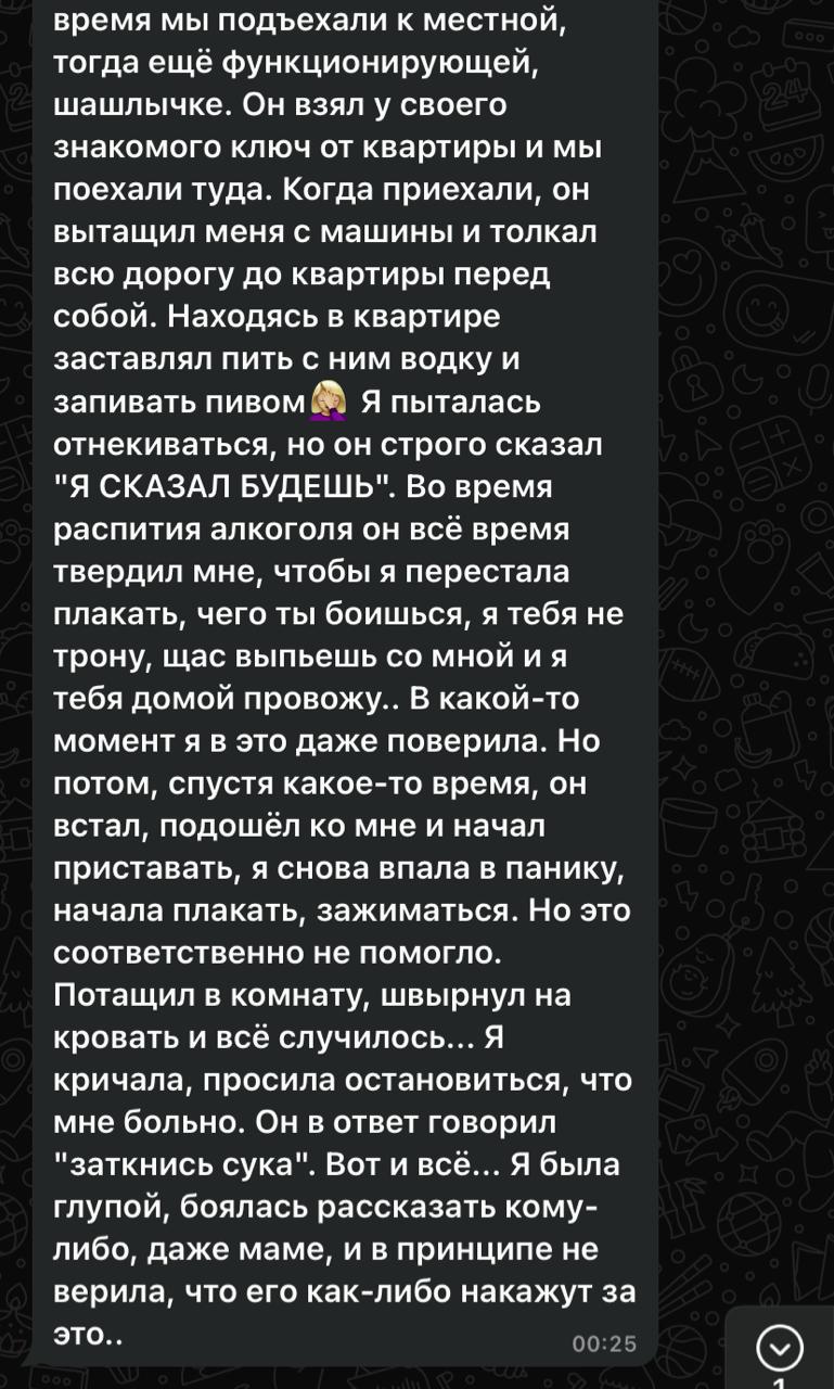 – Я лежала на заднем сидении, проснулась от того, что кто-то рядом сидит. Это был он [Цабиев], я перепугалась, пыталась открыть, все было заперто, передние кресла – водителя и пассажира сдвинуты вперед. Я уже без куртки. Рядом бита валяется, которой он всем угрожает. "Мы же взрослые люди, давай удовлетворим друг друга. И тогда никому больно не будет". А мне 16 лет. Какие взрослые люди?! Он схватил меня за руки (синяки еще долго не сходили) одной ручищей и стал сдергивать одежду. Я сопротивлялась (потом в военном управлении СК Полине скажут, что ее синяки на теле – "недостаточная улика"), но он стал угрожать: что, если продолжу сопротивляться, будет больно. Угрожал родным моим (у него есть возможность испортить им жизнь)... Потом он совершил этот половой акт, мне было ужасно больно, я кричала. И он сказал, что от моих криков у него... не знаю, как правильно сказать – не получается. И что я ему должна "помочь", если хочу домой живой вернуться. Потом стал угрожать, что в меня сделает это, если не соглашусь "рот открыть".