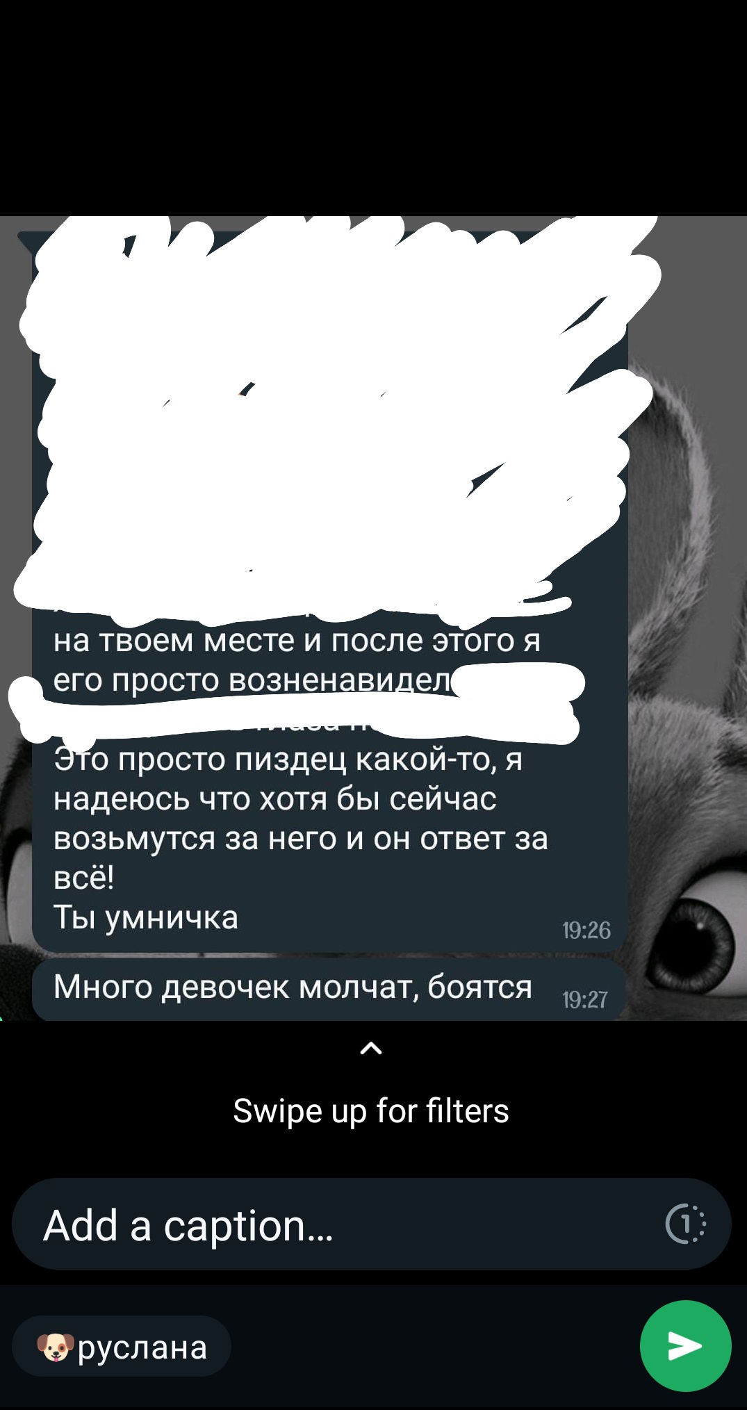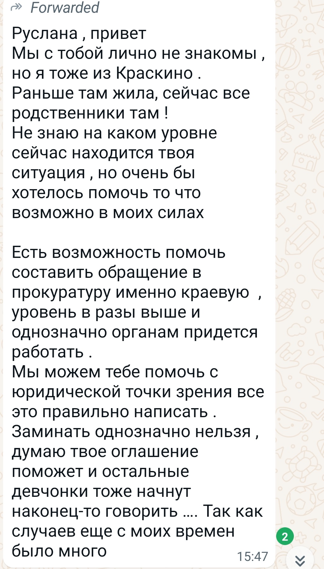 – Якобы по существу обвинения улик нет, так как на мне нет синяков и одежда у меня не рваная (хотя ранее этот же следователь говорил, что улики косвенные зачтутся и их много). При этом они одежду мою забрали и она пропала! Никакой экспертизы с ней они не делали! – возмущается Руслана. – Но сильнее всего меня бомбануло, когда этот следователь заявил, что никакой угрозы от Цабиева нет, якобы он в воинской части находится. Следак мне это по телефону говорит, а Цабиев через минуту мимо меня в центре Краскино проходит. Он тут постоянно. Я больше не за себя уже боюсь – он ведь продолжит насиловать. У меня сестра младшая растет тут. За других девочек страшно. Он же детей насилует.