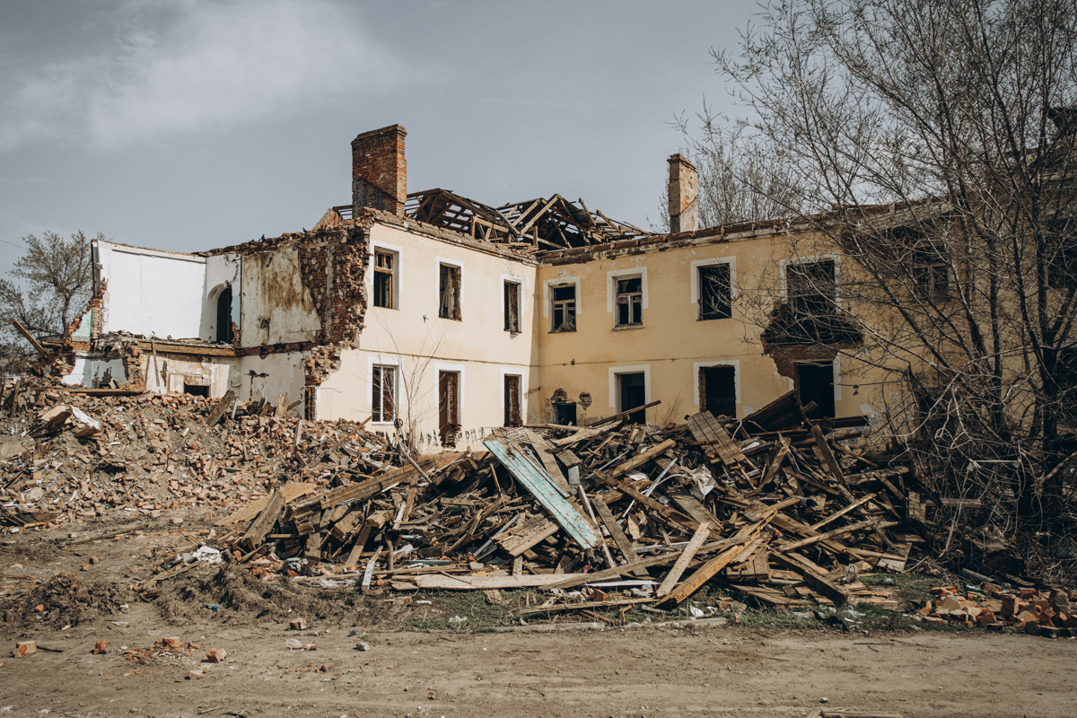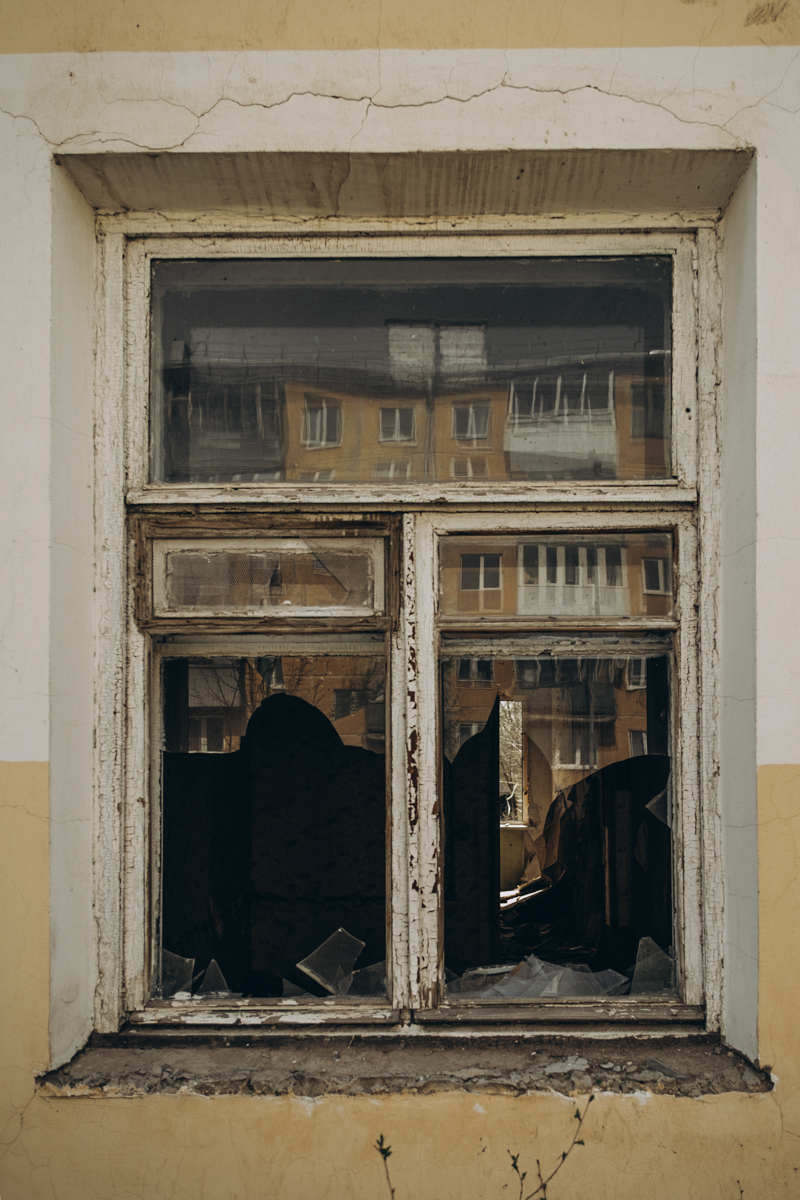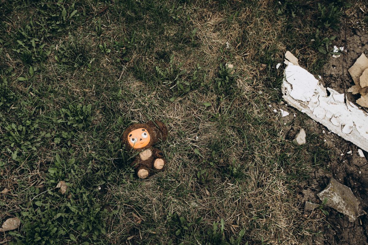 Детская игрушка под окнами разрушенного дома. Когда-то здесь звучал детский смех