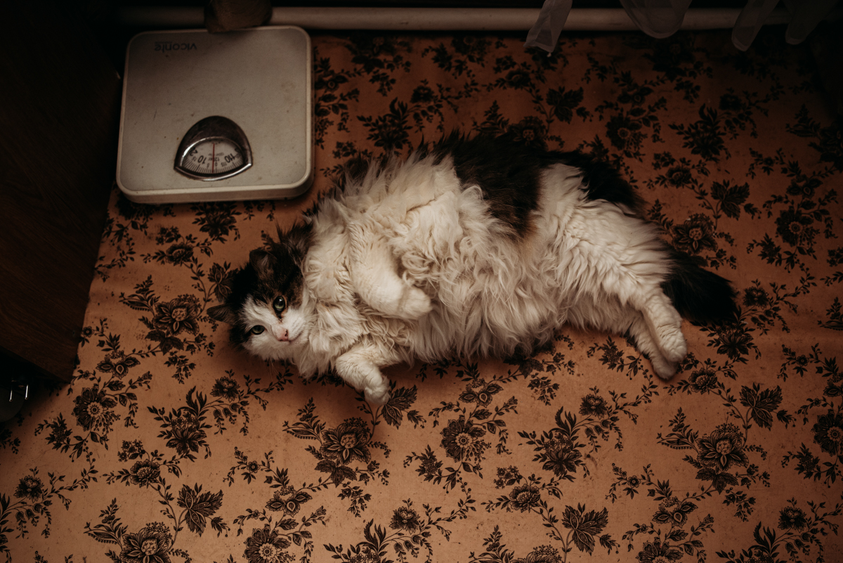 Кот Елены. Он забежал в квартиру маленьким грязным котенком в возрасте около месяца в момент, когда бабушка попросила вынести цветок алоэ ее знакомой. В день, когда у Елены был девичник