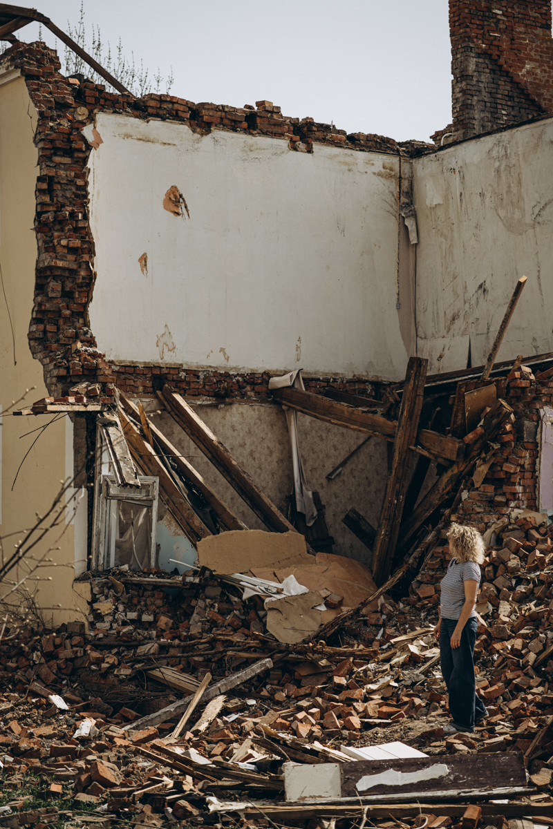 Елена на развалинах дома спустя два года после расселения. За стеной комната бабушки Елены