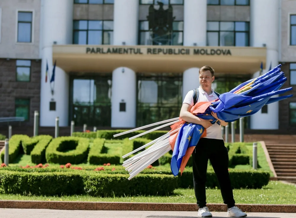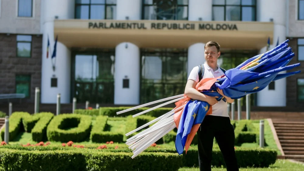 A young man holds flags after a march of PAS Youth, in front of Moldova's Parliament in Chisinau, Moldova, 01 June 2024. Photo: EPA-EFE/DUMITRU DORU