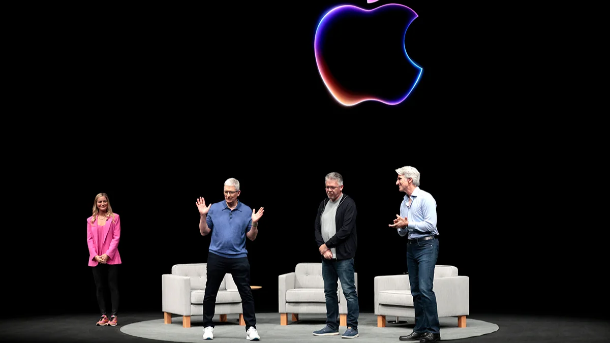 Тим Кук (2-й слева) представляет собеседников во время беседы об Искусственном интеллекте Apple в театре Стива Джобса во время Всемирной конференции разработчиков Apple 2024 (WWDC) в кампусе Apple Park в Купертино, Калифорния, США, 10 июня 2024 года. Фото: John G. Mabanglo / EPA-EFE