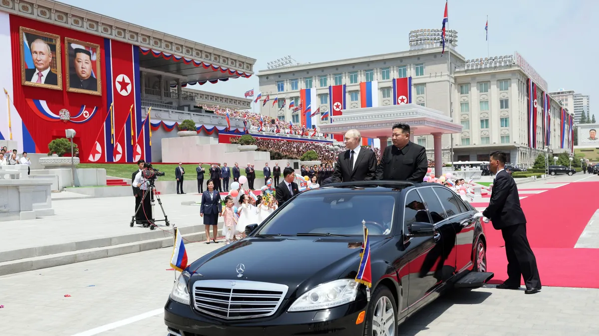 Kim Jong Un and Vladimir Putin arrive on Pyongyang’s Kim Il Sung Square for an offficial welcoming ceremony, 19 June 2024. Photo: EPA-EFE / GAVRIIL GRIGOROV / SPUTNIK / KREMLIN POOL