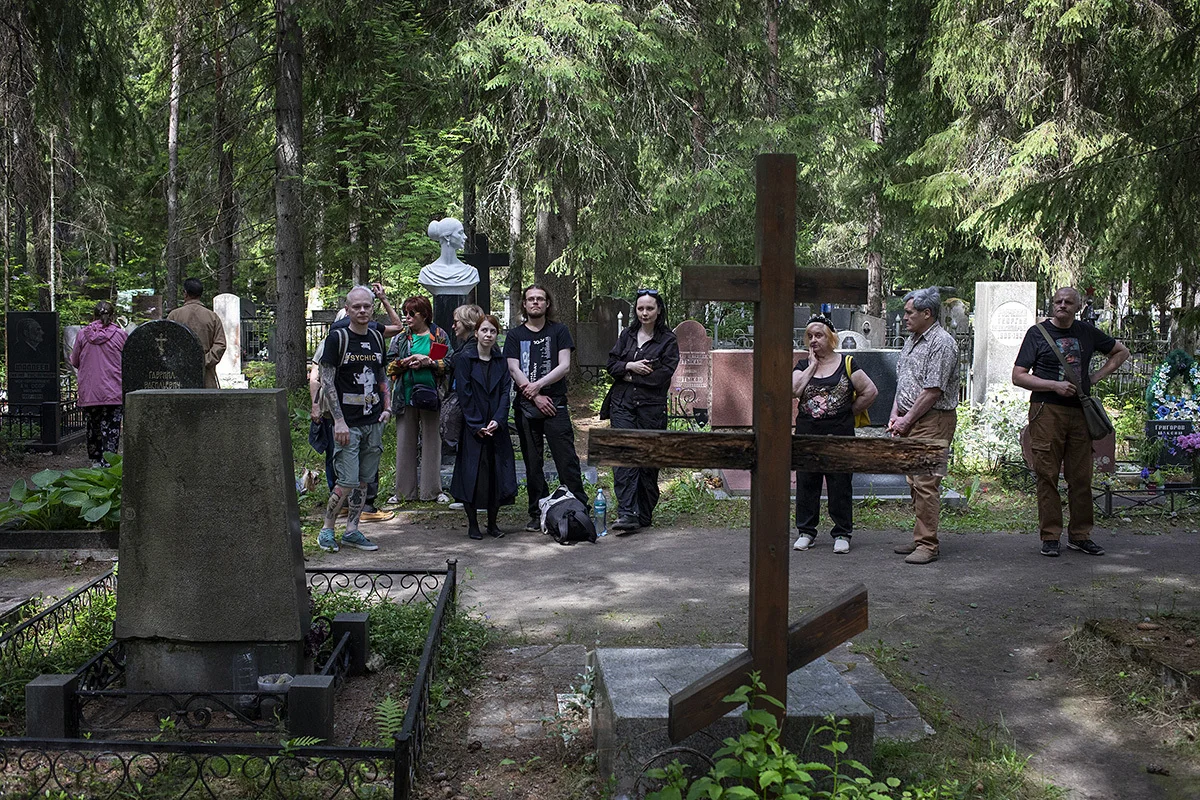 Точка входа. Комаровское кладбище — место упокоения литературной, театральной, архитектурной элиты. Кого тут только нет — воздушное пространство в кронах деревьях забито всевозможными музами. Они теперь все вместе: Ахматова, Каравайчук, Лихачёв, Курёхин, Алфёров, Гранин, Авербах и многие другие. Земля их приняла и объединила. Место, где не важны политические взгляды и пристрастия. Прохладная тень, а в ней два ухоженных деревянных креста: один — над Сергеем, второй — над его безвременно ушедшей дочерью Лизой. Красные небольшие цветы вокруг, как капельки крови, напоминающие о большом, с трудом помещавшемся в грудной клетке сердце. Подвело оно, не выдержало. Чуть поодаль от могилы нерешительно, разбившись на группы, переминаются с ноги на ногу, ведут неспешные беседы близкие, друзья, знакомые, да и просто почитатели творчества Курёхина, пришедшие сюда в этот день.