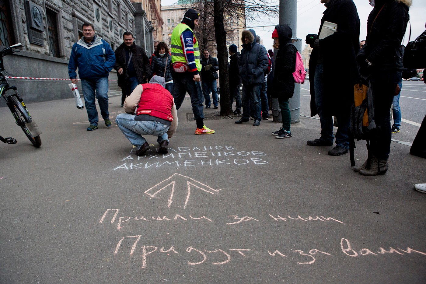 Тем вечером тротуар у здания ФСБ на Лубянке стал новой важной точкой протеста — как будто подчеркнуто милого в противовес угрюмой истории места. Асфальт изрисовали мелками: «ФСБ пытает людей», «Пришли за ними, придут и за вами». На лужайке сбоку оппозиционеры играли в петанк.