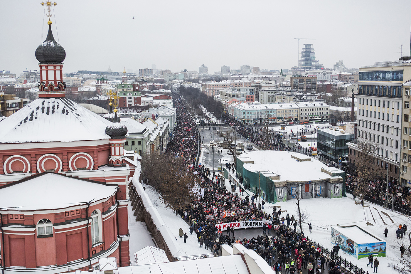 Людоедская жестокость закона возмутила многих: у Думы день за днем винтили пикетчиков, петиции собирали десятки тысяч подписей. Оппозиционеры даже провели отдельный марш против «закона подлецов», как стали называть поправки. Мне было очень важно показать масштаб протеста, и я в жуткий мороз — балаклавы силовиков покрывались инеем от дыхания — несколько раз заранее прошел по маршруту, чтобы найти окно с идеальным видом. На марш пришло за сто тысяч человек, а я с час трезвонил в двери намеченных квартир и все-таки снял идеальную панораму.