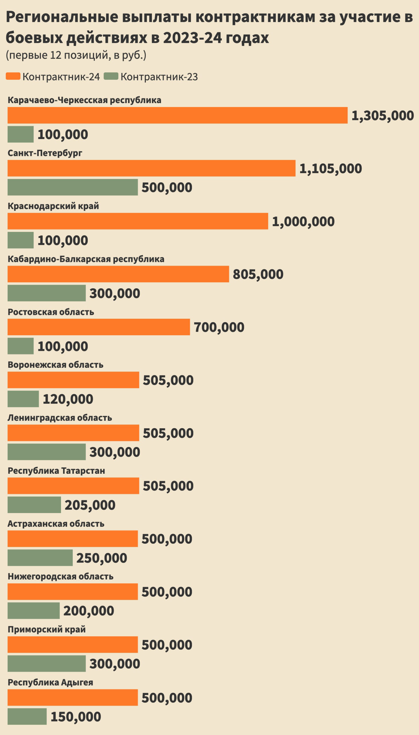 В Карачаево-Черкесии региональную выплату подняли буквально на днях. Глава республики Рашид Темрезов заявил об увеличении единовременного поощрения для участников "СВО" до 1,3 млн рублей. Ранее контрактникам в регионе платили лишь 100 тысяч. Карачаево-Черкессия, республика с населением 434 тысячи человек, входила в число регионов России, где желающим заключить контракт с Министерством обороны, выплачивали одно из самых низких мотивационных поощрений в стране.