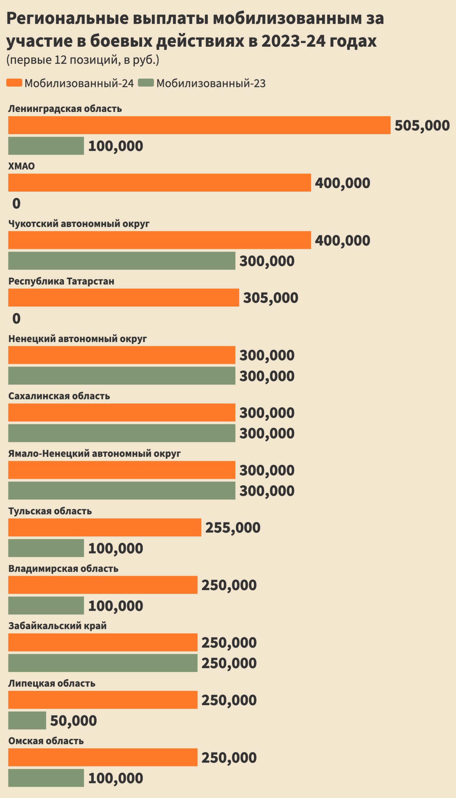 В семи российских регионах мобилизованным заплатят по 150 тысяч – в Хабаровском и Приморском краях, в Тверской, Магаданской, Амурской областях, в Чувашии и Еврейском автономном округе.