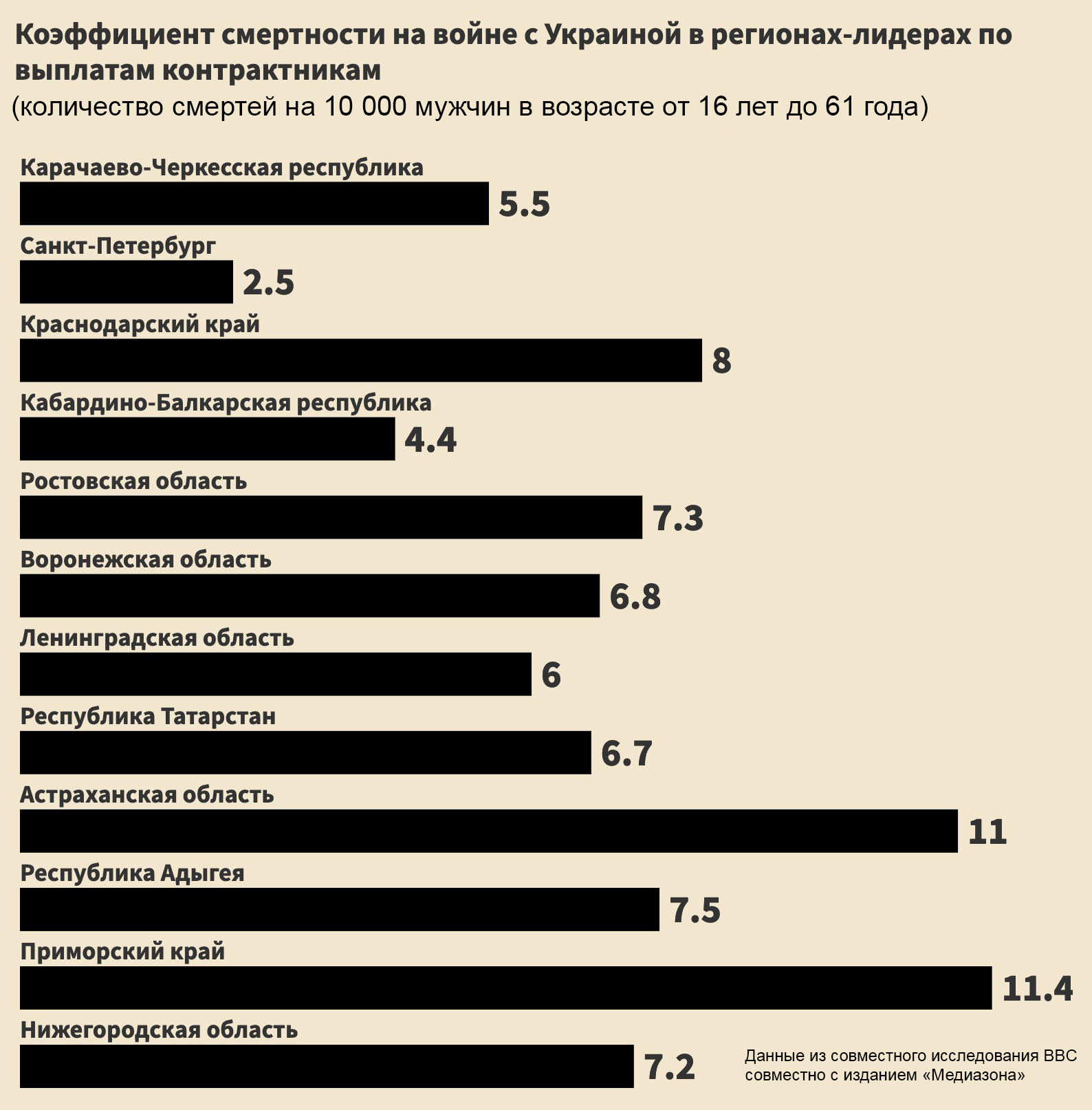 Если сравнить топ российских регионов – аутсайдеров по выплатам за войну с индексом смертности на войне (количество смертей на 10 000 мужчин в возрасте от 16 лет до 61 года – опубликован в совместном проекте "Медиазоны" и BBC), то мы увидим, что платят там мало, а гибнут много.