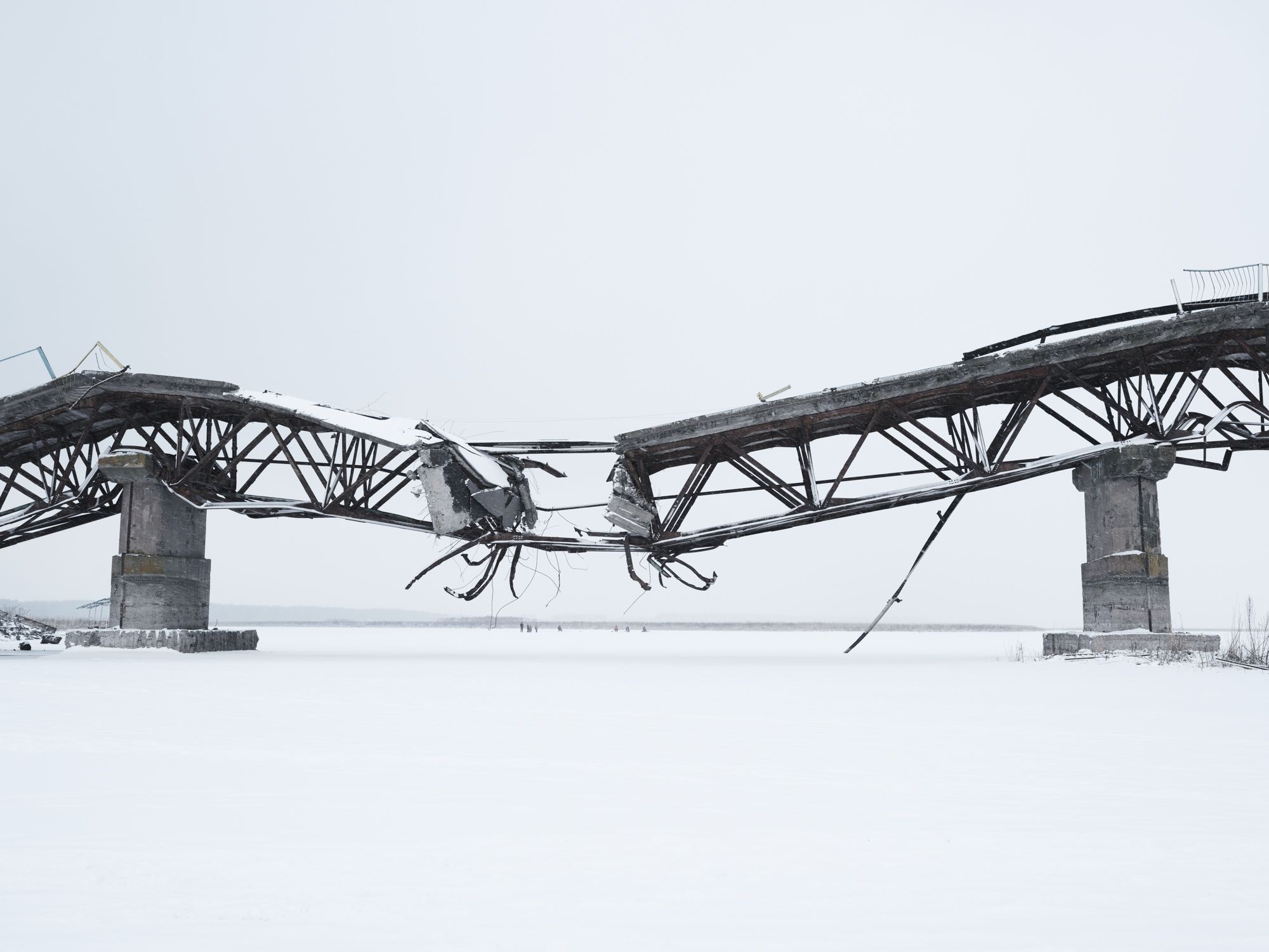 Последние две зимы я провел на Донбассе: брал машину и в одиночку бродил по минным полям. Снимал места, где были бои [после начала крупномасштабного вторжения]. Зимой там абсолютная пустота — и совершенно промерзшие танки, окопы, заброшенные блокпосты, разрушенные дома. Я ждал, пока все покроется снегом и инеем, и снимал белые пейзажи. Потому что после войны, если человечество не остановится, только это от нас и останется.