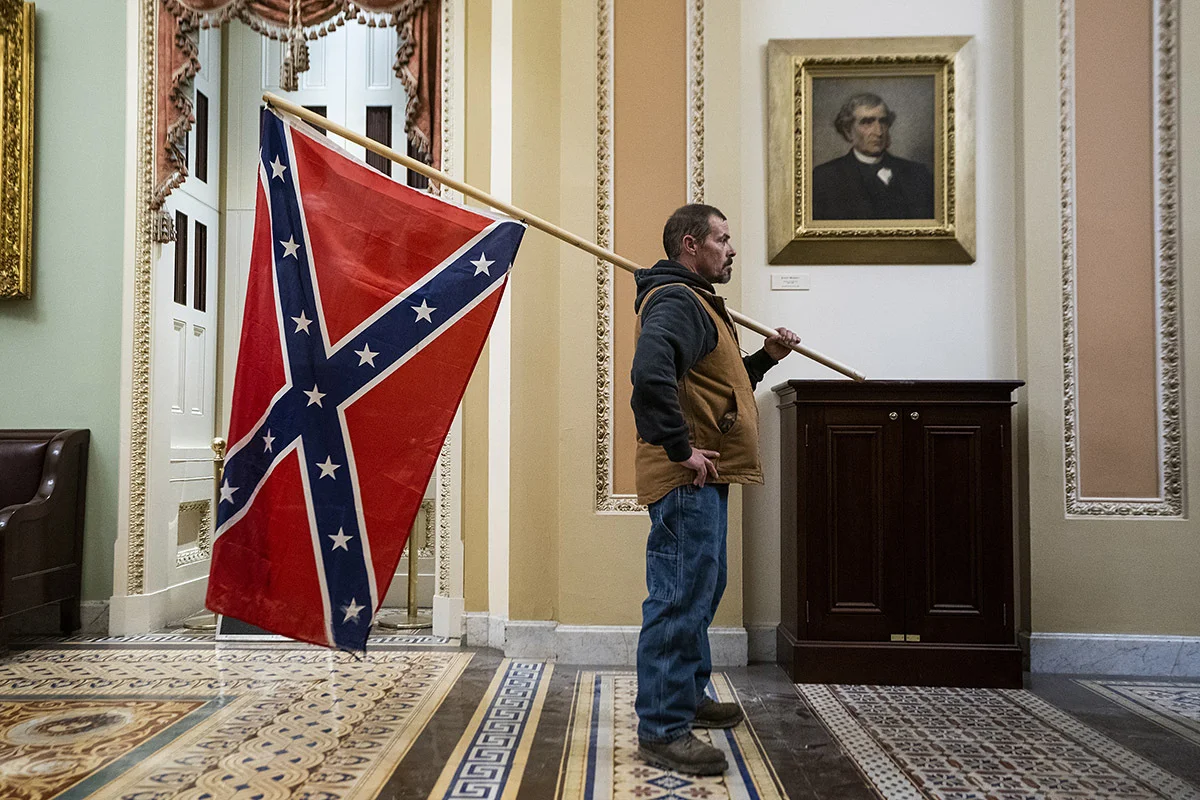 Сторонник Дональда Трампа с флагом Конфедерации во время осады Капитолия США 6 января 2020 года. Фото: Jim Lo Scalzo / EPA-EFE