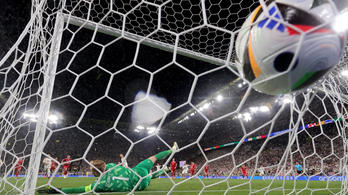 Кай Хавертц (Германия) забивает гол с пенальти в ворота вратаря Каспера Шмейхеля (Дания) во время матча между сборными командами Германии и Дании в Дортмунде, Германия, 29 июня 2024 года. Фото: Christopher Neundorf / EPA-EFE