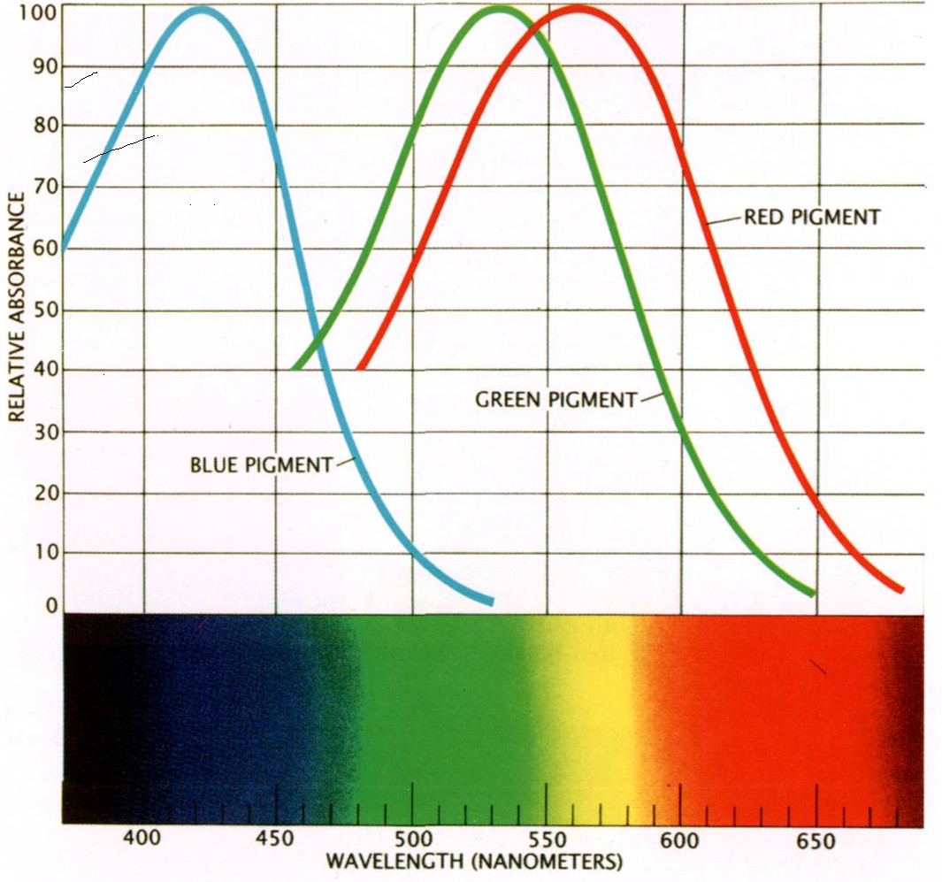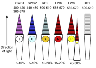 Спектральную чувствительность рецептора (колбочки, палочки) определяет зрительный пигмент, встроенный в мембрану наружного сегмента рецептора. Зрительный пигмент — это комплекс белка (опсина) и альдегида витамина А (хромофора). Опсины фотопигментов кодируются специальными генами. Существуют четыре группы опсинов. Они произошли в результате дупликации гена предкового опсина позвоночных и последующих мутаций более 500 млн лет назад. У современных рыб, рептилий и птиц опсины принадлежат к четырем предковым группам опсинов позвоночных. Молекулярная структура опсина + хромофор определяет форму и положение максимума кривой спектральной чувствительности зрительного пигмента. Положение максимума чувствительности зависит от аминокислотных замен в нескольких «чувствительных» сайтах молекулы опсина и типа хромофора. Хромофор зрительных пигментов морских и наземных позвоночных — это альдегид витамина А1, а хромофор пресноводных рыб — альдегид витамина А2. Колоколообразные кривые пигментов, содержащих в качестве хромофора альдегид витамина А2, сдвинуты в красную область спектра на ~50 нм относительно содержащих альдегид А1 (рис. 1).