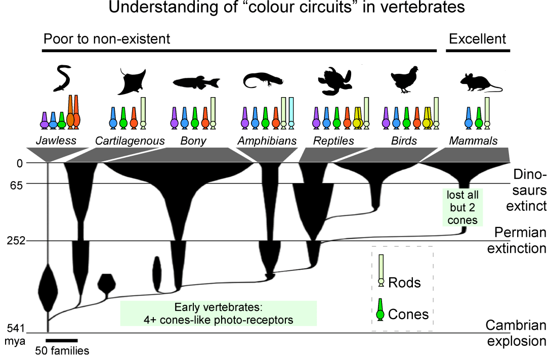 Строгое определение цветового зрения (ЦЗ) — это способность различать излучение по длине волны, независимо от интенсивности. Для этого необходимо (1) иметь в сетчатке не менее двух приемников — двух типов рецепторов с разной спектральной чувствительностью и (2) иметь возможность сравнивать сигналы этих рецепторов. Существует гипотеза, что механизм сравнения сигналов соседних рецепторов (латеральное торможение), полезный для подчеркивания границ, выделения контуров предметов, существовал в глазах, формирующих изображение, до появления в рецепторах двух разных зрительных пигментов [1]. Есть и другая точка зрения, что механизм сравнения длин волн не требует хорошей оптики и мог бы существовать и до появления глаз, формирующих изображение [2]. Авторы этих двух гипотез едины в одном: ЦЗ у позвоночных возникло более 500 млн лет назад и с тех пор поддерживается эволюцией. У беспозвоночных ЦЗ возникло еще раньше [3].