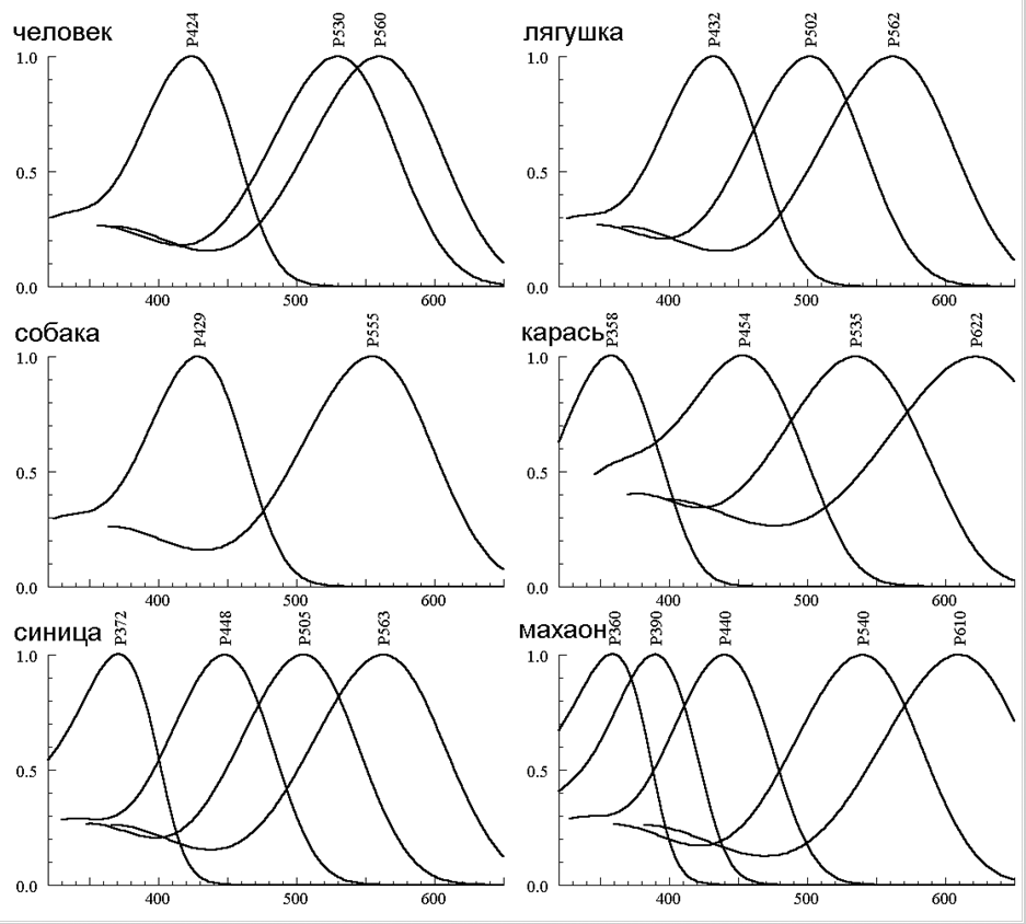 Глядя на наборы рецепторов с разной спектральной чувствительностью у разных животных, мы понимаем, что все животные видят мир по-своему, по-разному, в разных спектральных диапазонах, не так, как мы (рис. 1, 2, 3). Мы не видим в далеком красном диапазоне (длиннее 700 нм), а пресноводные рыбы видят там прекрасно. Мы не видим УФ (у нас нет УФ-чувствительных колбочек). У мышей, многих рыб (у мальков) и птиц, черепах и четырех сумчатых есть УФ-чувствительные колбочки. Морские черепахи часто попадают в рыболовные сети и гибнут. Недавно появилось сообщение, что если сети освещать УФ, то черепахи попадают в них значительно реже: они их видят и обходят [19].