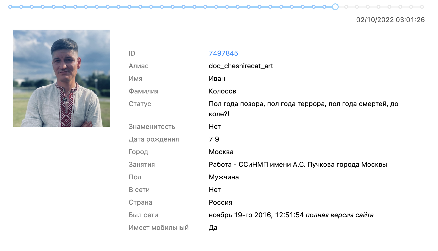 Изучив сохраненные копии соцсетей Колосова, «Медиазона» выяснила, что он окончил Московский Казачий Кадетский Корпус, а после работал фельдшером на станции скорой и неотложной медицинской помощи имени Пучкова в Москве.