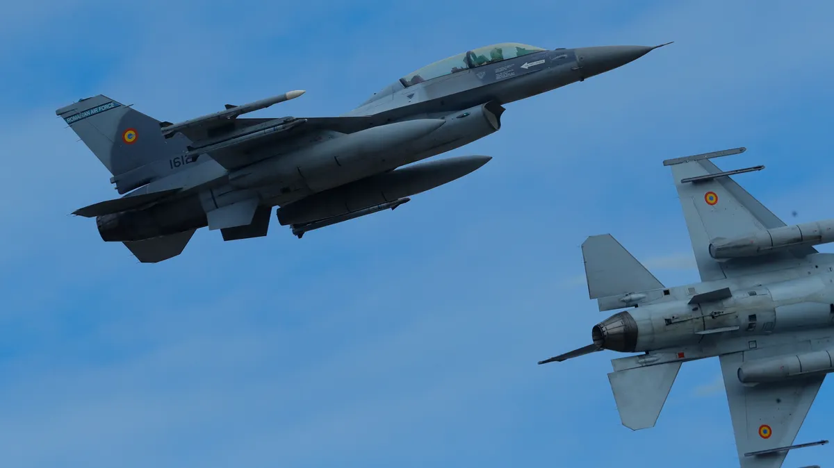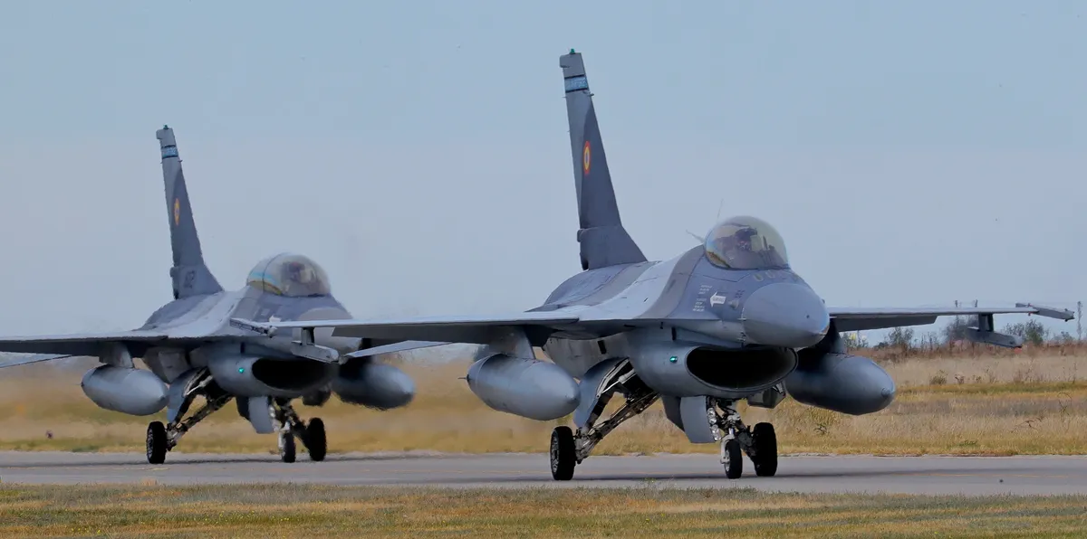 Two F-16 Falcons flying manoeuvres at the 86th Air Base in Borcea, Romania, 13 November 2023. Photo: EPA-EFE / Robert Ghement