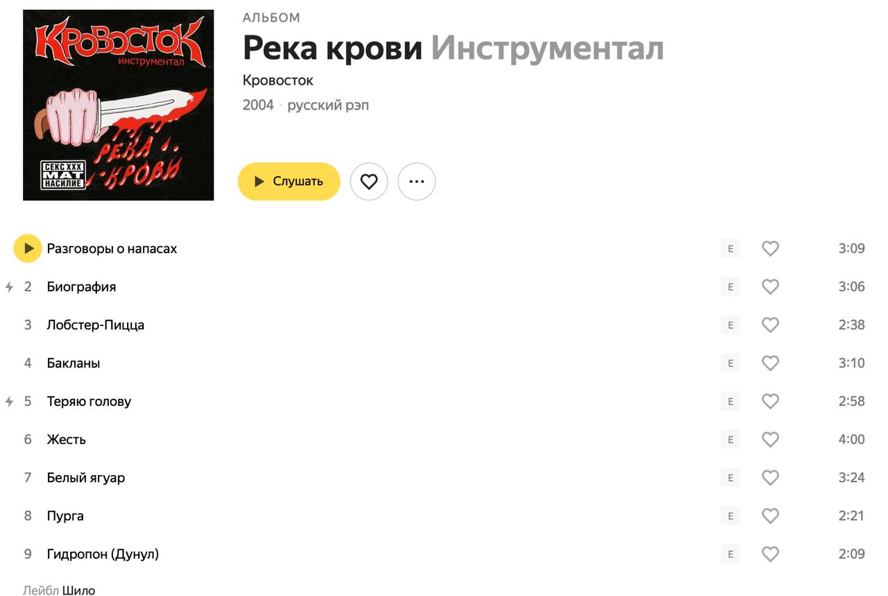 «Яндекс Музыка» уведомила о требовании Роскомнадзора цифрового дистрибьютора «Кровостока». Представители группы отказались удалять трек, и поэтому площадка заблокировала весь альбом — теперь на «Яндекс Музыке» доступна только инструментальная версия «Реки крови».