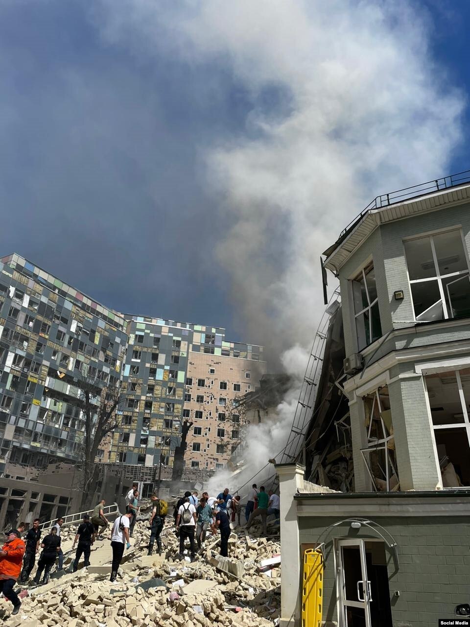 Помимо детской больницы, разрушения есть и в других районах Киева. В районе станции метро "Лукьяновская" загорелся бизнес-центр, а в Шевченковском районе Киева полностью разрушен подъезд пятиэтажного жилого дома. Ещё один жилой дом повреждён в Соломенском районе.
