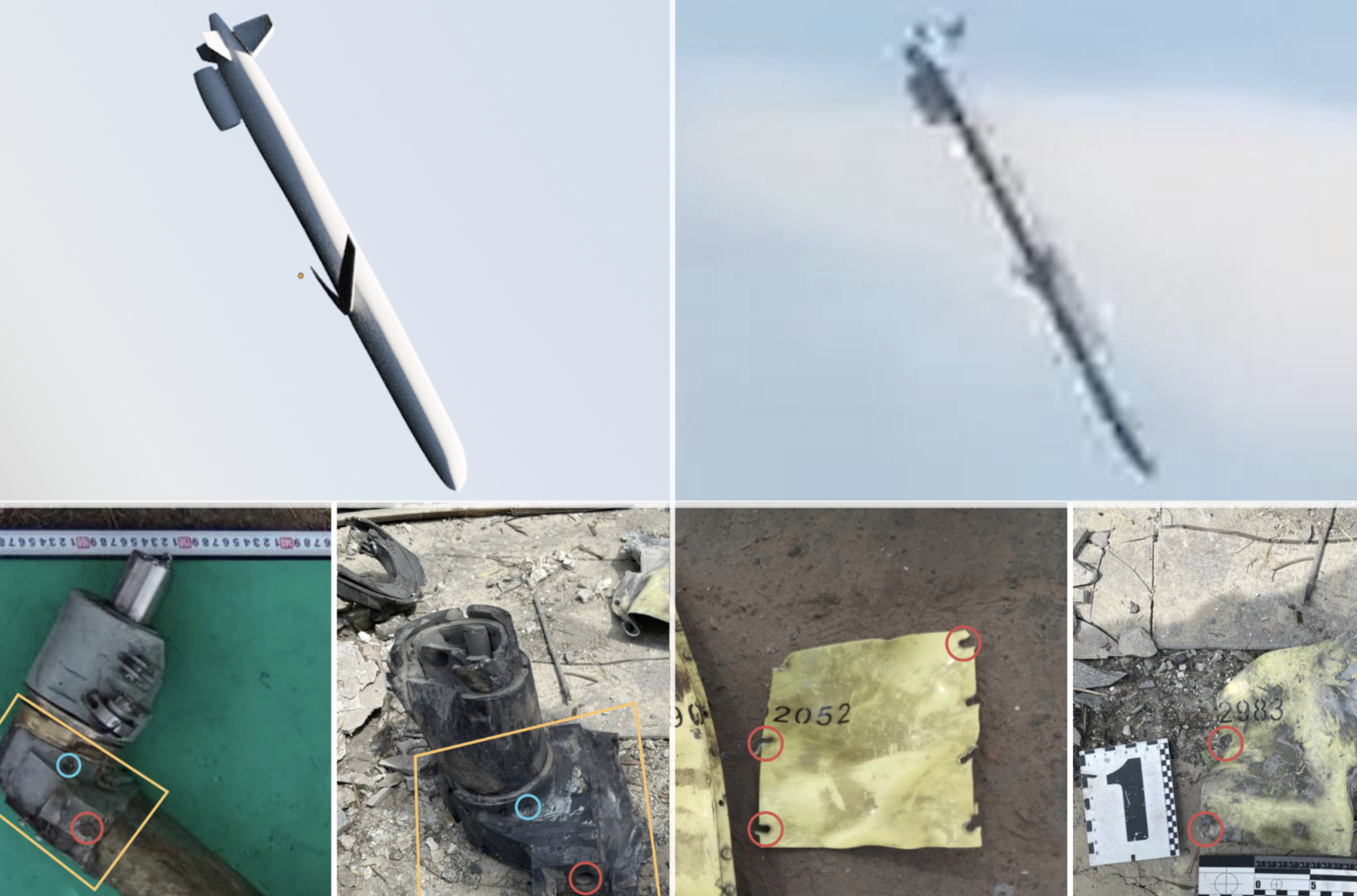 Сравнение скриншота ракеты, поразившей госпиталь, с 3D-рендерингом ракеты Х-101 показывает, что эти две ракеты действительно имеют общие черты. Наложение двух изображений на видео также демонстрирует совпадение черт и пропорций 3D-модели Х-101 и ракеты, разрушившей больницу.