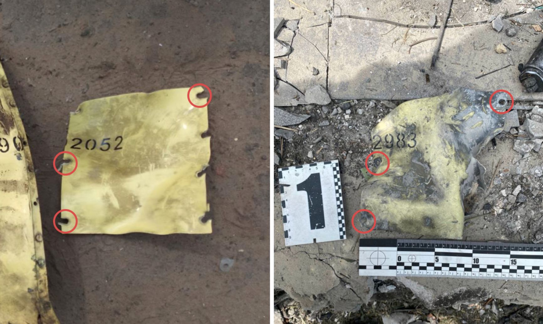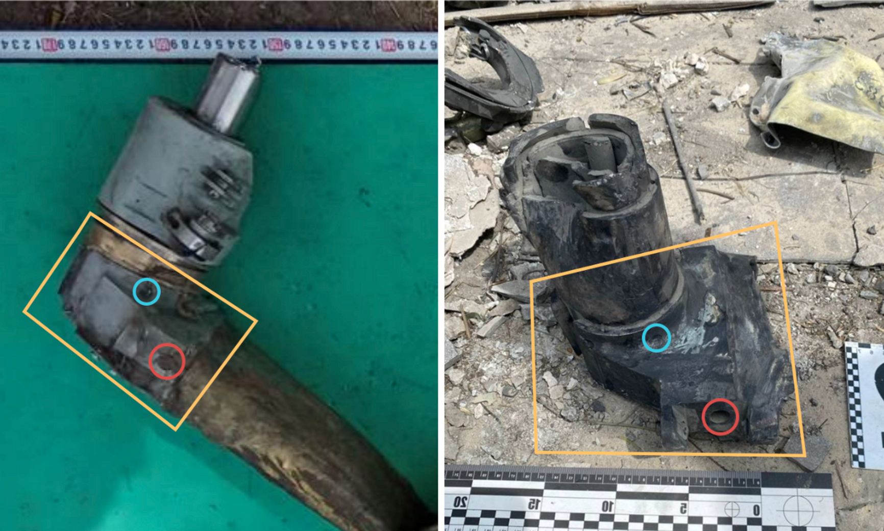 Слева — кадр опорного лонжерона из справочника по идентификации войск территориальной обороны. Справа — изображение остатков боеприпаса (для наглядности перевернутое по горизонтали), опубликованное СБУ после нападения на киевскую больницу. Расположение отверстий на снимке СБУ (красная и синяя аннотации), а также общая форма (желтая аннотация) на обоих изображениях совпадают.