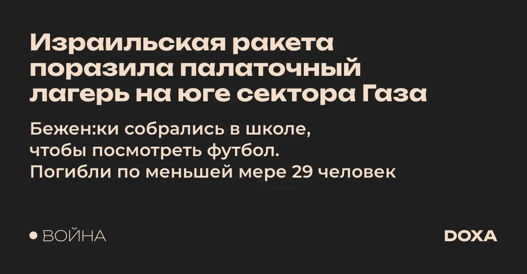 Израильская ракета поразила палаточный лагерь на юге сектора Газа. Бежен:ки собрались в школе, чтобы посмотреть футбол. По словам палестинских чиновни:ц, удар произошел, когда зритель:ницы собрались на территории школы в Абассане к востоку от Хан-Юниса, а торговцы продавали печенье. Погибли по меньшей мере 29 человек. Израильские военные заявили, что изучают сообщения о пострадавших мирных житель:ницах. В заявлении ЦАХАЛ говорится, что в ходе обстрела «точным боеприпасом» был поражен боец ХАМАС, принимавшего участие в атаке на Израиль 7 октября.