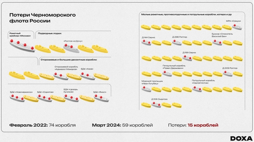 По словам экспертов, с которыми пообщалась DOXA, в Крыму остались главным образом корабли обеспечения. СМИ, со ссылкой на украинских военных сообщали, что российские корабли уже почти месяц не выходят в открытое море из порта Новороссийска.
