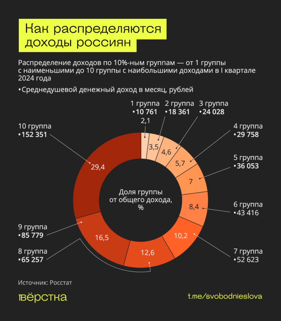 Чтобы понять, как именно расслаивается общество, используют систему децилей: население делят на 10 групп по 10% — от самых бедных до самых богатых. Затем исследователи измеряют средний доход на человека внутри этой группы и смотрят, какая часть общих денег всех жителей страны (100%) сконцентрирована в руках того или иного дециля. Так, если брать данные Росстата на 1 января 2024 года, в стране проживают 146,203 млн человек, и каждый дециль представлен 14,6 млн граждан. Беднейшие люди могут рассчитывать на 10 761 рубль в месяц, и им принадлежит всего 2,1% общего дохода, тогда как богатейшие россияне владеют их третью (29,4%). В месяц они получают 152 351 рубль.