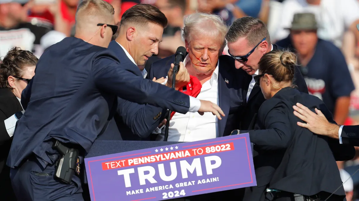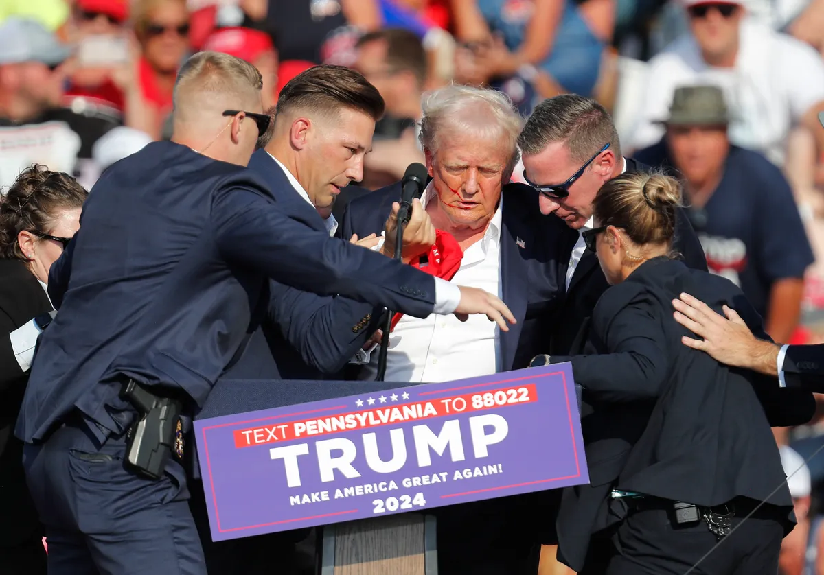 Предвыборный митинг Трампа проходил в городе Батлере под открытым небом. Сразу после того, как республиканец начал выступление, в толпе послышались выстрелы. Кандидат в президенты США залез под трибуну, вооруженные охранники попытались его прикрыть