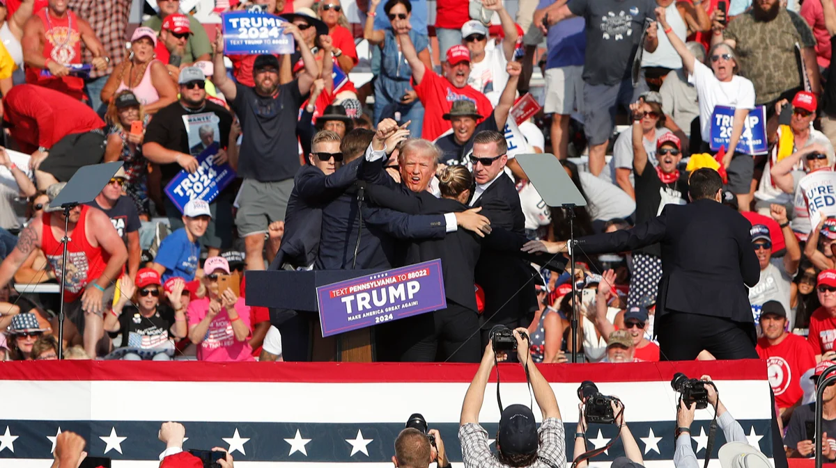 Дональда Трампа уводят со сцены после покушения во время предвыборного митинга, Пенсильвания, США, 13 июля 2024 года. Фото: David Maxwell / EPA-EFE