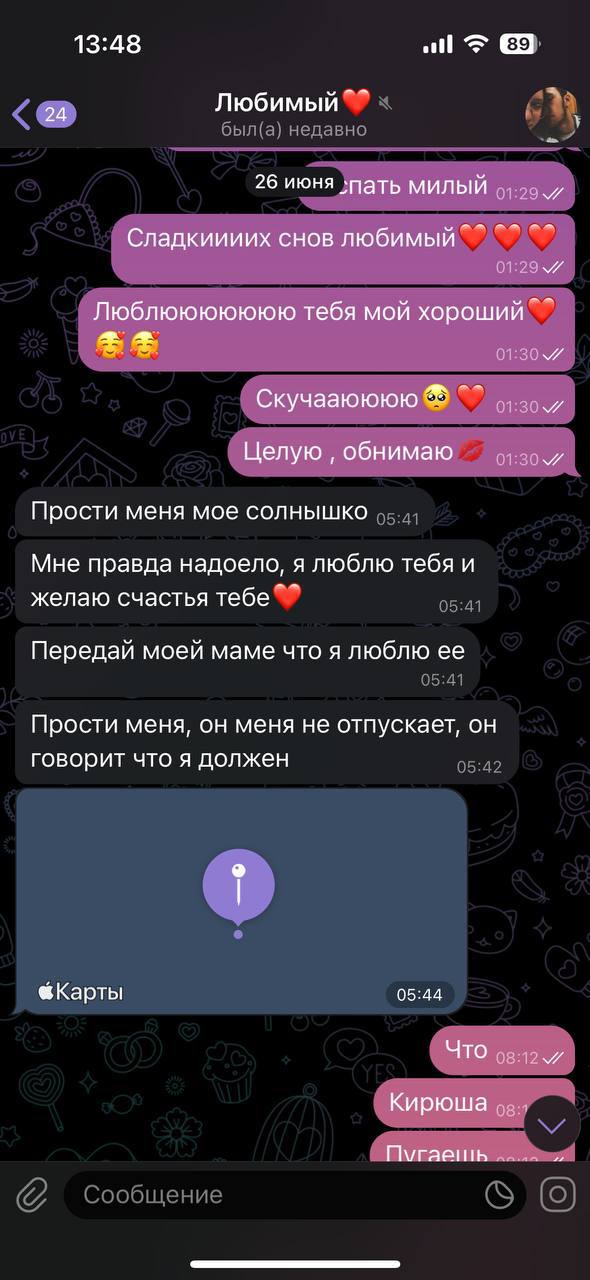 – Мы с ним на связи круглые сутки. Он не спит полночи и дольше – и я старалась дождаться, чтобы пожелать спокойной ночи. В ту ночь полпервого мы так же переписывались, я написала "Целую, обнимаю", смайлик. А он молчит. Вижу, что в сети и молчит. Такого никогда не было. Потом в 5 утра странное сообщение, вообще не похожее на него не то, что интонацией, а даже выбором слов и знаками препинания. Какое солнышко? Он меня все время зая называл. И что за тон – как будто прощается и прощения просит? И геолокация! Я испугалась, позвонила маме его. Считаю, это не он писал. К тому же он бы обязательно написал своей маме параллельно, не только мне, – говорит Ксения.