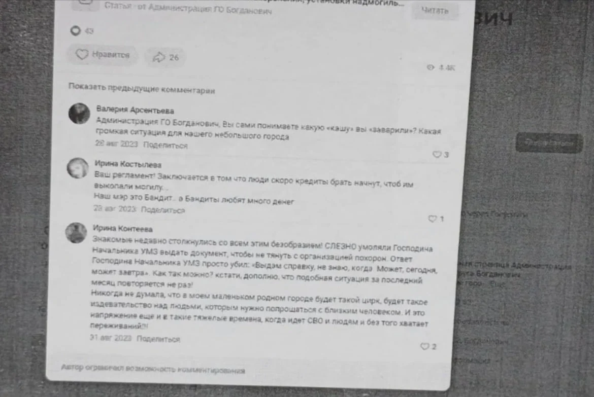 «У нас идет рейдерский захват кладбища. И этому способствует наш мэр Нейфельд! Скоро копка могил будет стоить от 70 тысяч рублей <…> Ваш регламент заключается в том, что скоро люди кредиты будут брать, чтобы им выкопали могилу. <…> Наш мэр — это бандит, а бандиты любят много денег», — написала Костылева в августе 2023 года.
