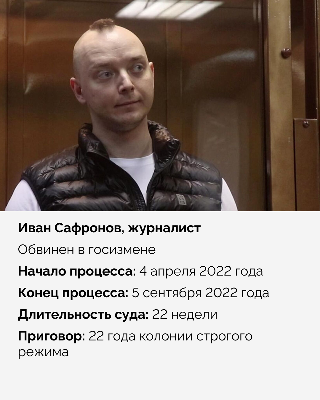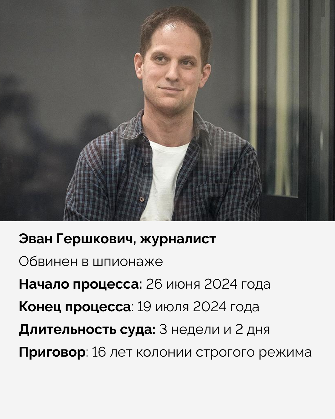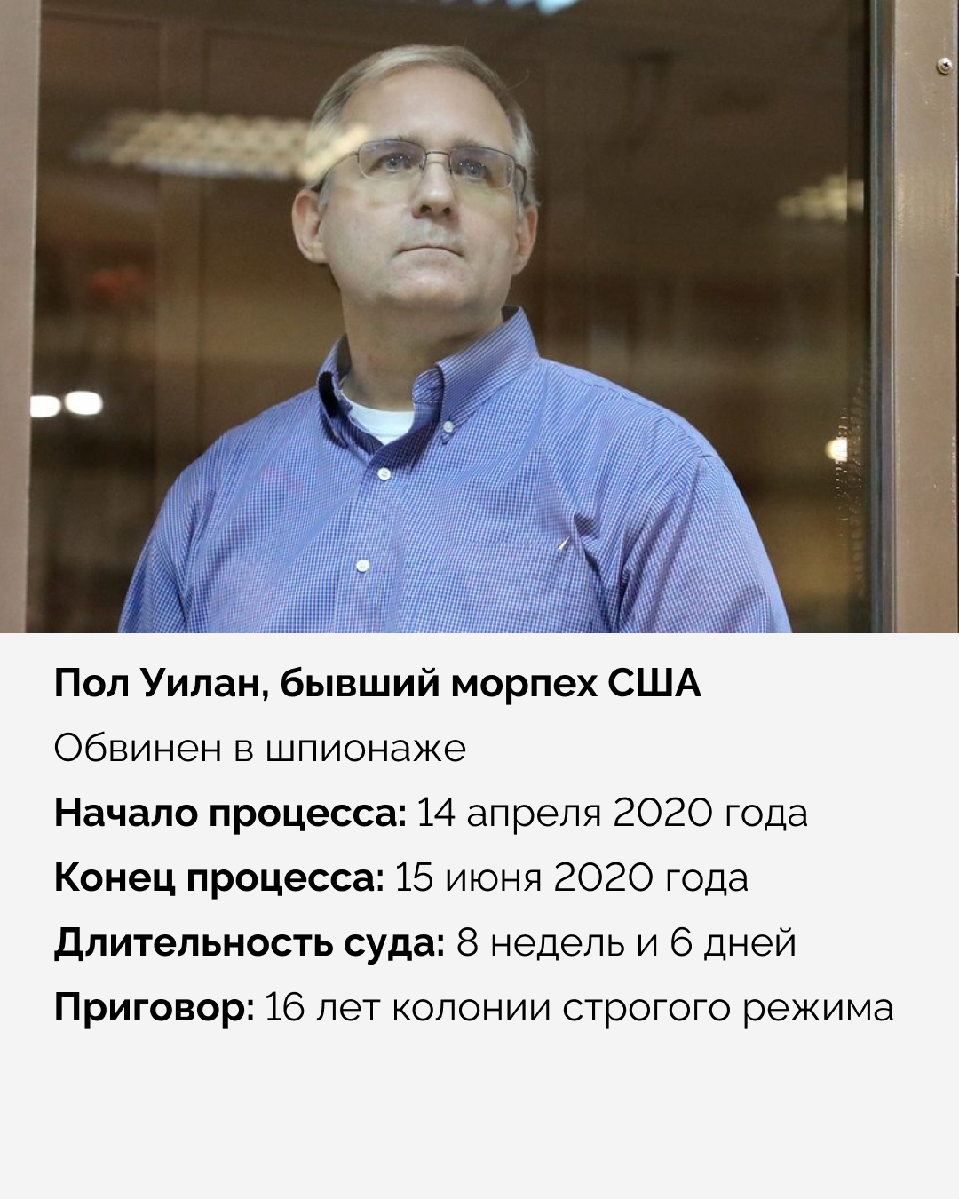 В пятницу суд в Екатеринбурге вынес приговор по первому со времен холодной войны шпионскому делу против западного журналиста – репортер The Wall Street Journal Эван Гершкович получил 16 лет колонии при требовании прокуратуры в 18 лет. Точно так же четыре года назад закончился другой громкий шпионский процесс, по которому проходил другой гражданин США Пол Уилан. Но в отличие от того процесса слушания по делу Гершковича длились всего три недели и два дня. Из последних громких процессов о госизмене и шпионажу быстрее закончился только суд над основателем Group IB Ильей Сачковым.