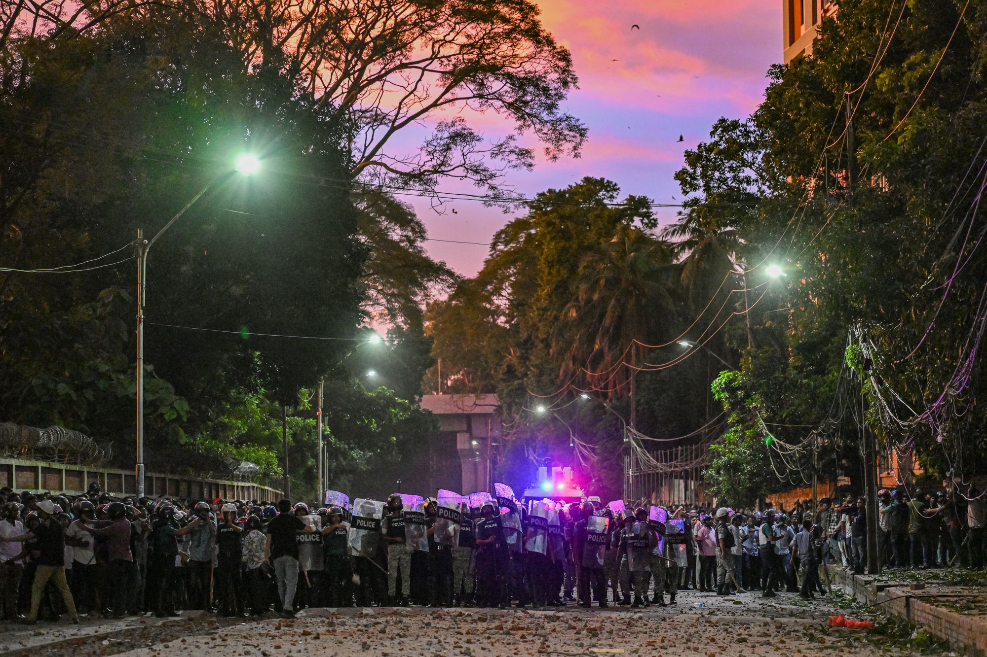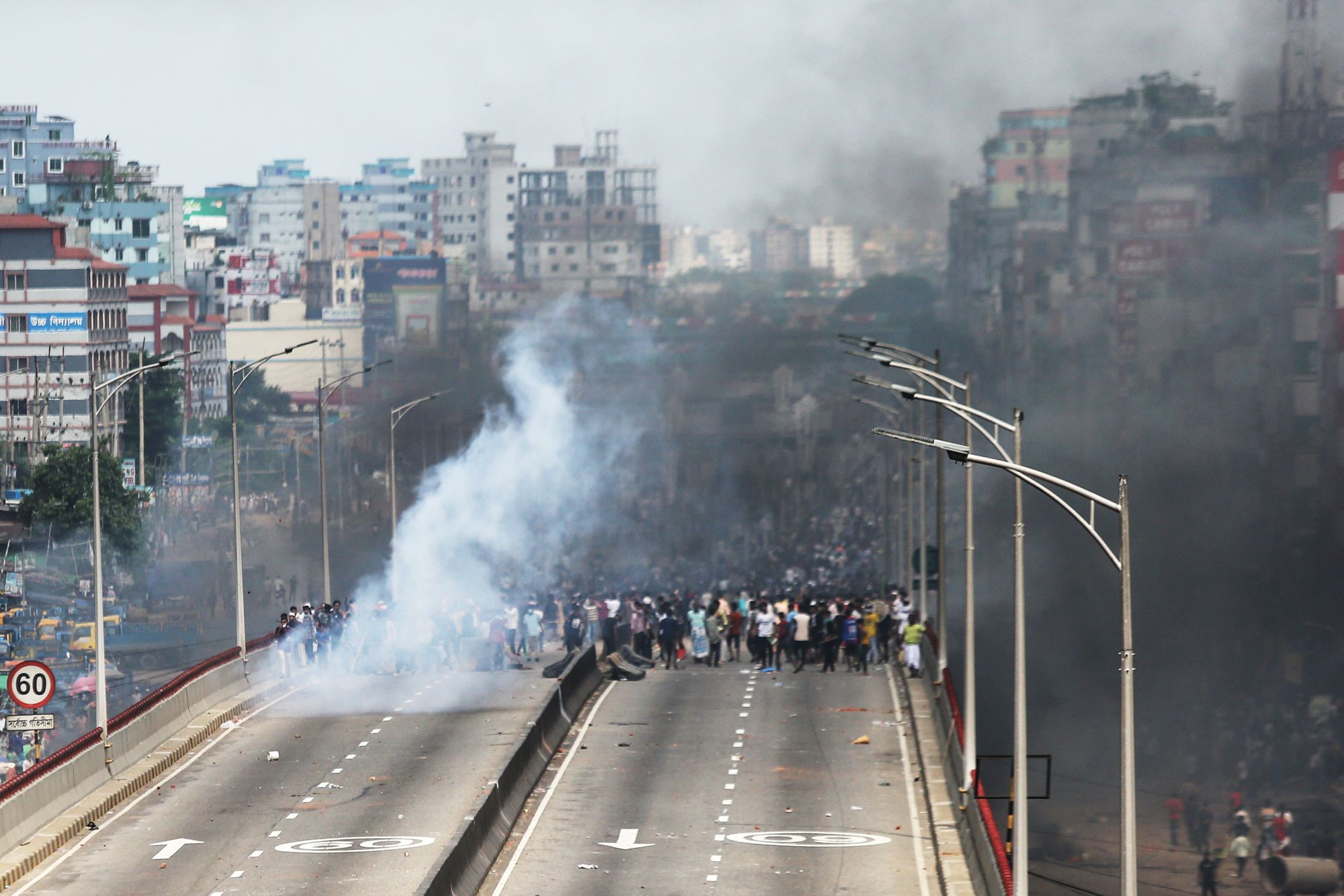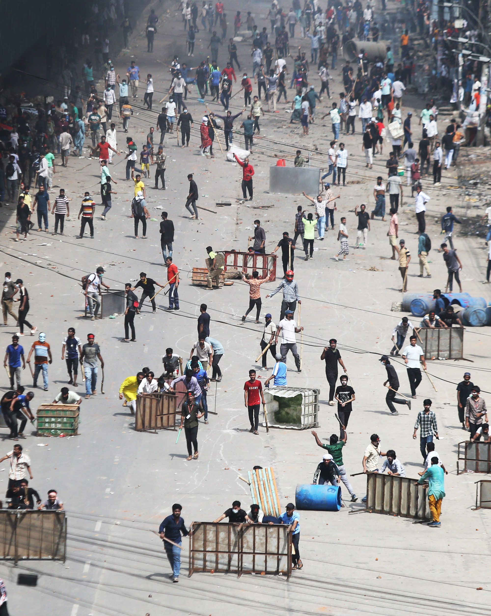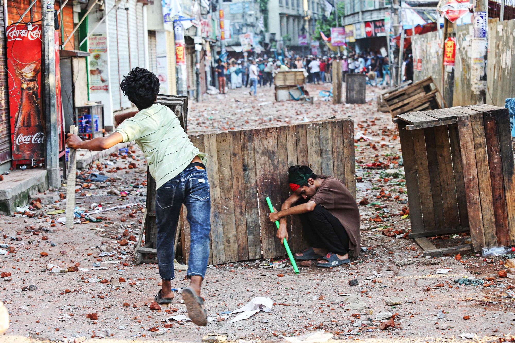 Протесты переросли в беспорядки после столкновений протестующих со сторонниками сохранения системы квот — участниками студенческого крыла партии «Авами лиг», которую возглавляет премьер-министр страны Шейх Хасина. К разгону демонстрантов привлекли полицию и военных. Они применили слезоточивый газ и резиновые пули. В ответ, как утверждают власти, протестующие подожгли здание государственной телекомпании BTV и полицейский участок.