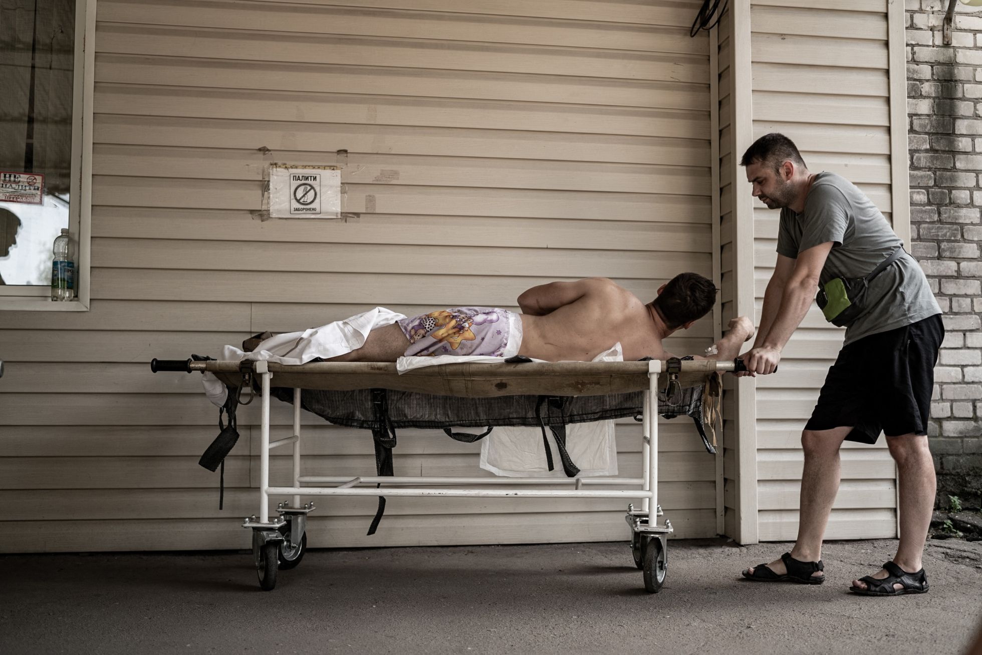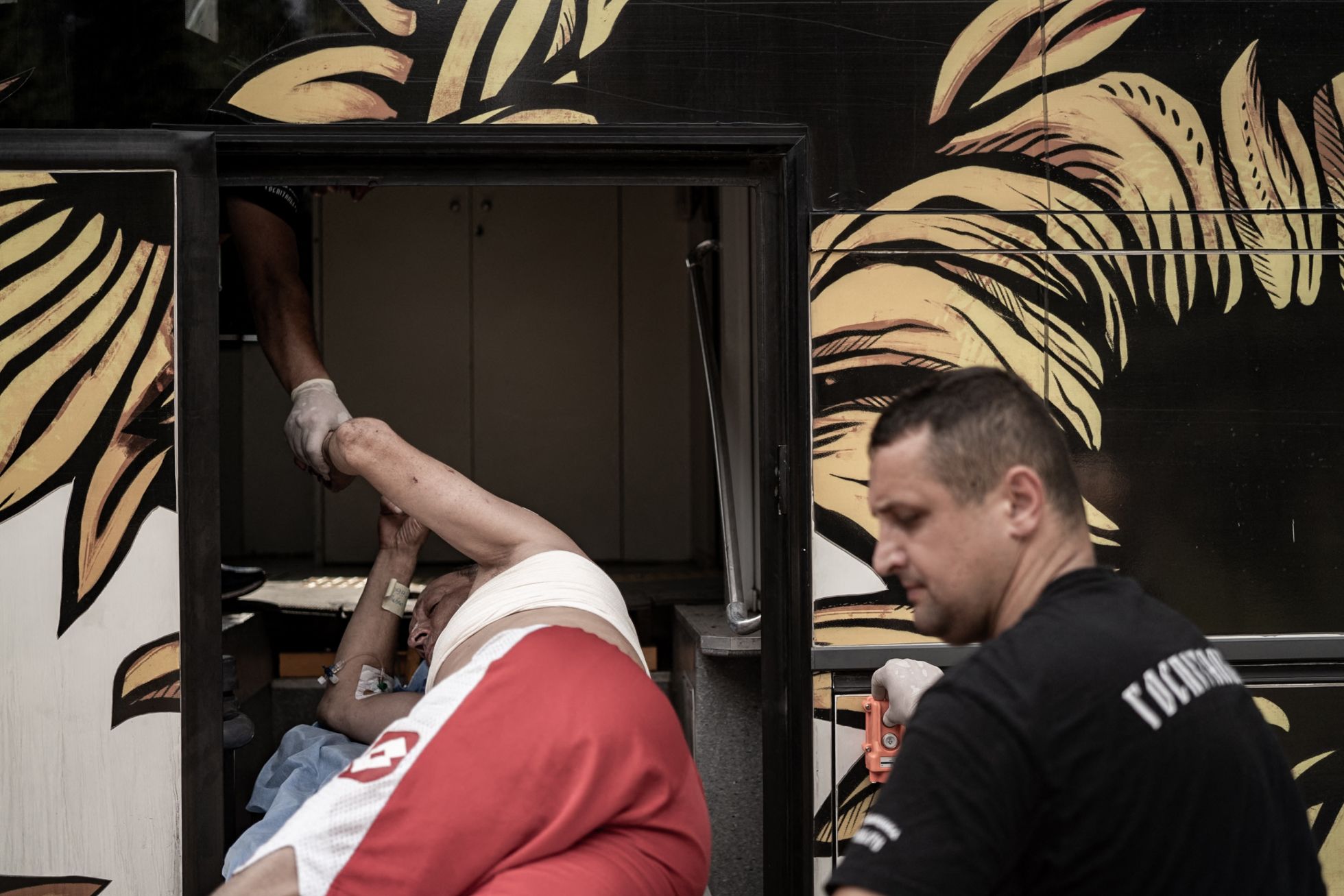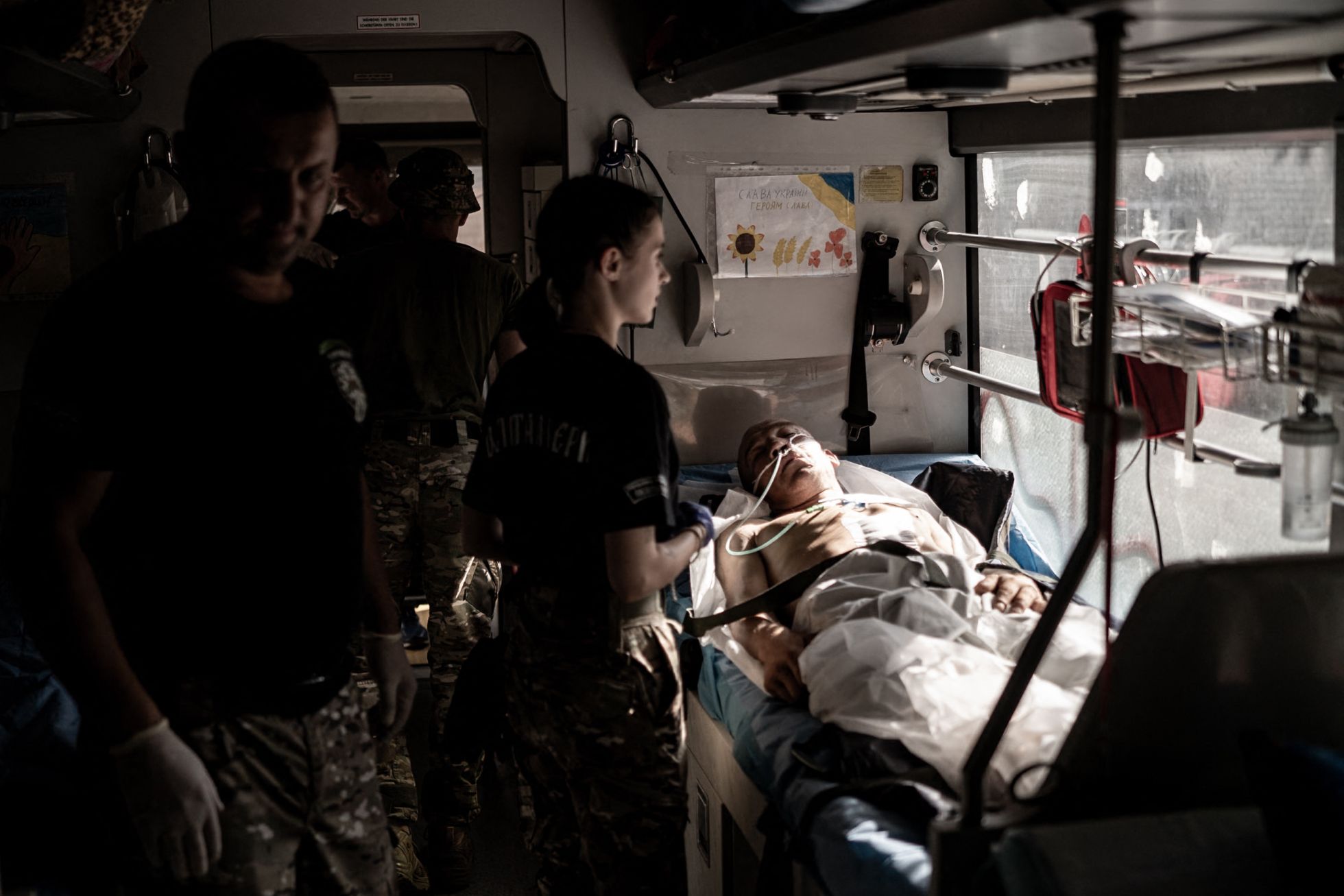 Фотограф турецкого агентства Anadolu Винченцо Чиркоста побывал на фронте в Донецкой области, где стал свидетелем эвакуации раненых военнослужащих ВСУ. Снимки сделаны 19 июля, точное место съемки не раскрывается. Военных с линии фронта вывозят на специально оборудованном больничном автобусе участники добровольческого медицинского батальона «Госпитальеры». Среди военнослужащих есть тяжелораненые с ампутированными конечностями. К какому подразделению ВСУ они относятся, неизвестно.