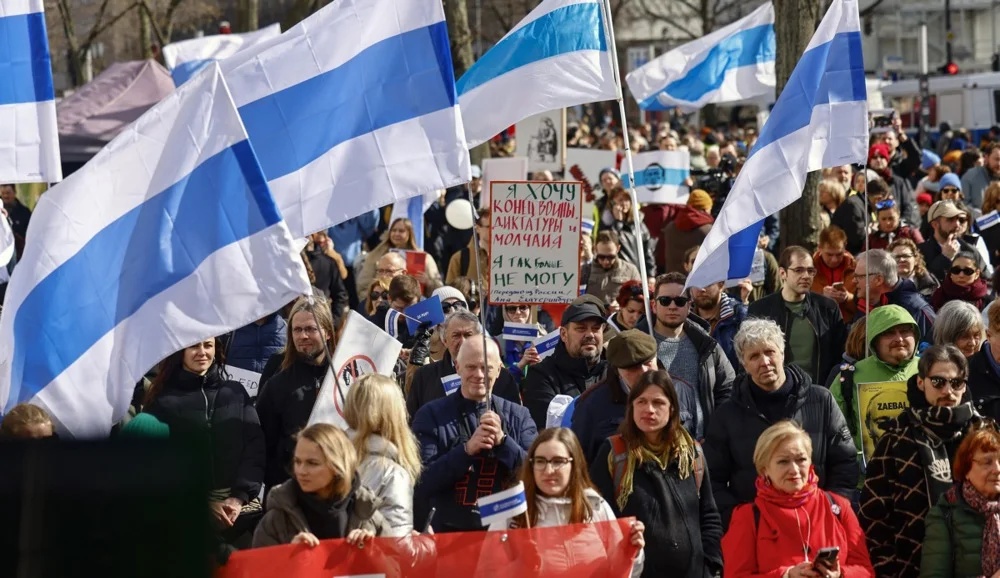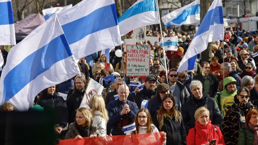 An anti-Putin protest in Berlin on 17 March, election day in Russia. Photo: EPA-EFE/HANNIBAL HANSCHKE