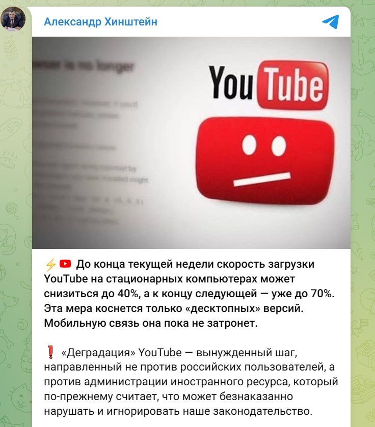 Детали. До конца этой недели скорость загрузки YouTube на стационарных компьютерах может снизиться до 40%, а к концу следующей — уже до 70%, написал Хинштейн в своем телеграм-канале. Депутат назвал это «мерой», которая пока «коснется только десктопных версий» и «не затронет мобильную связь». «Но это только начало», — предупредил единоросс.