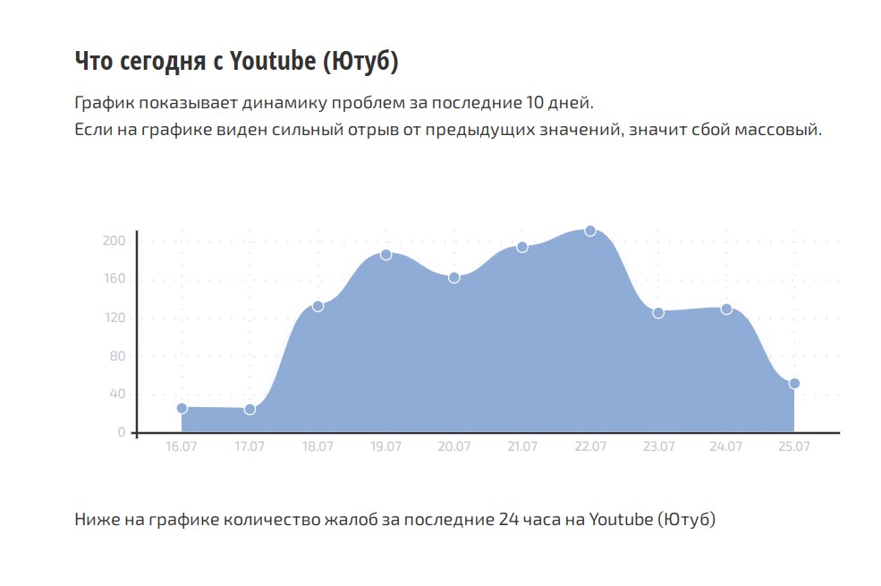 При этом сервисы, фиксирующие сбои в работе интернет-ресурсов, аномально высокого роста жалоб пользователей на работу YouTube в среду и четверг не фиксировали. Количество жалоб было даже ниже, чем пятницу, субботу, воскресенье и понедельник, свидетельствует график сервиса «Сбой.рф».
