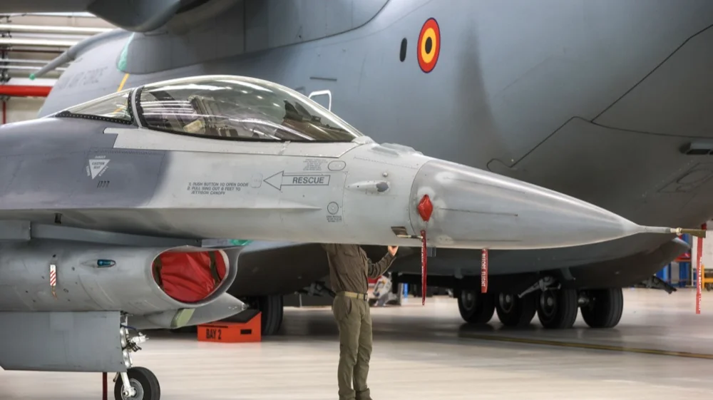A Belgium F-16 fighter jet to be sent to Ukraine in Brussels, Belgium, 28 May 2024. Photo: EPA-EFE/OLIVIER HOSLET
