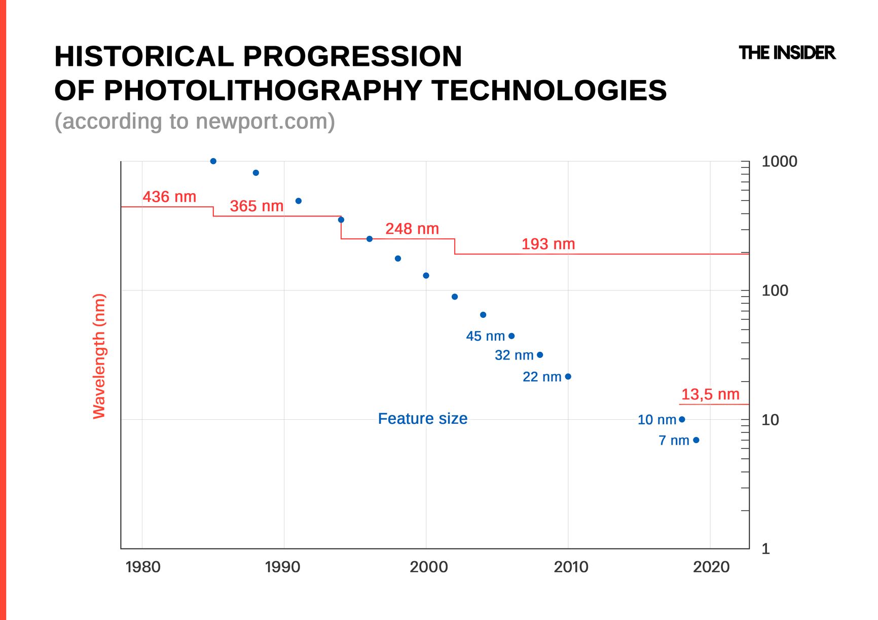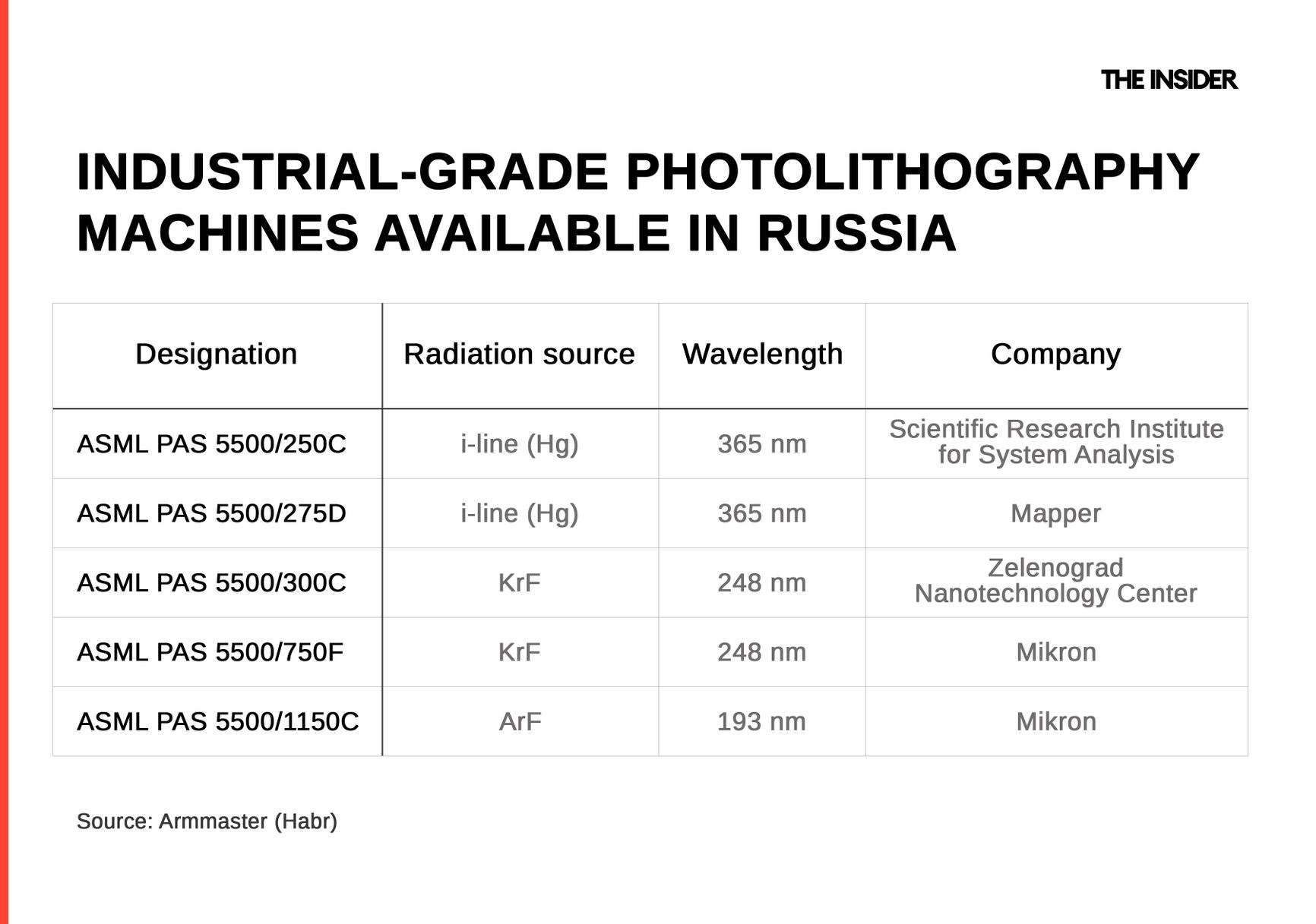 An ASML spokesperson assured The Insider that the company has never sold substantial amounts of equipment to Russia. Since 2014, $50 million worth of ASML-branded goods have been imported into the country. The dollar value may appear significant, but in fact it is not enough to buy even a single modern lithography system, as prices vary from $100 million to $400 million. Russia only imported parts of dismantled old equipment from third countries, ASML asserts. Ukrainian publication Ekonomichna Pravda largely confirms this assessment. As of 2022, five industrial ASML installations with wavelengths ranging from 365 to 193 nm were reported to be in operation in Russia: at the Scientific Research Institute for System Analysis, Mapper, Zelenograd Nanotechnology Center, and Mikron.