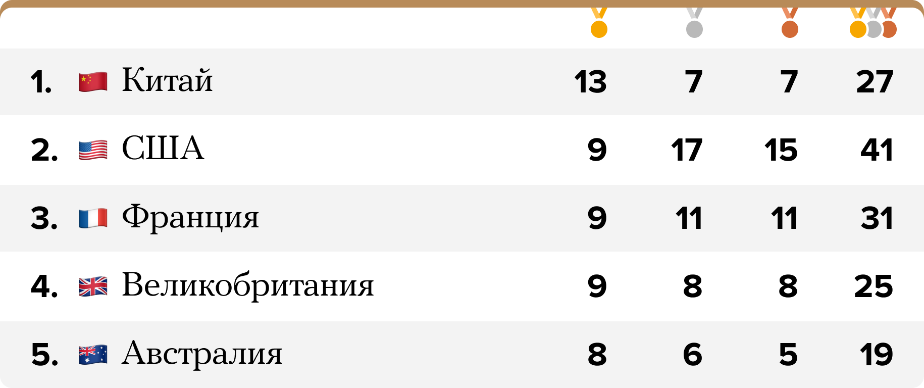 Китай продолжает лидировать в медальном зачете — 2 августа к 11 наградам высшего достоинства добавились еще две, в бадминтоне и прыжках в воду. США благодаря трем золотым медалям, выигранным в вечернюю сессию 1 августа, впервые с начала турнира поднялись на второе место. У россиян все еще ни одной медали. Данные в таблице приведены по состоянию на 19:30 мск 2 августа.
